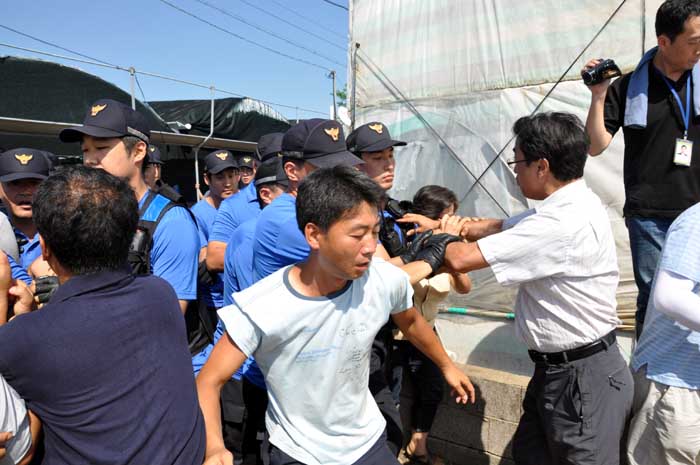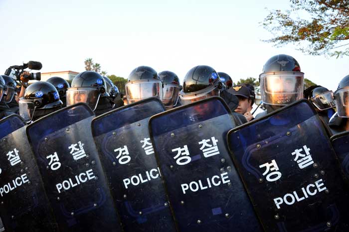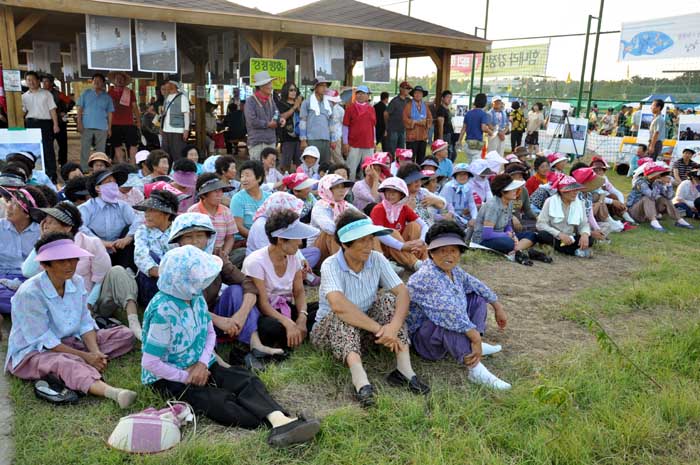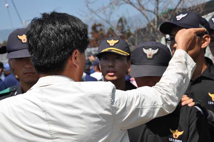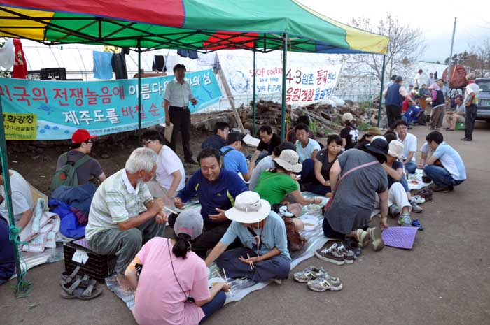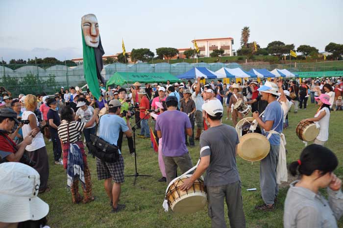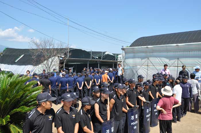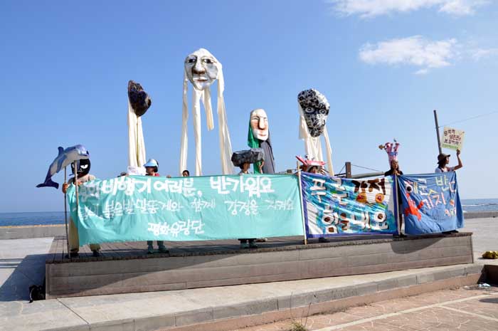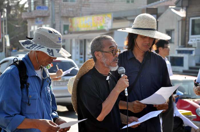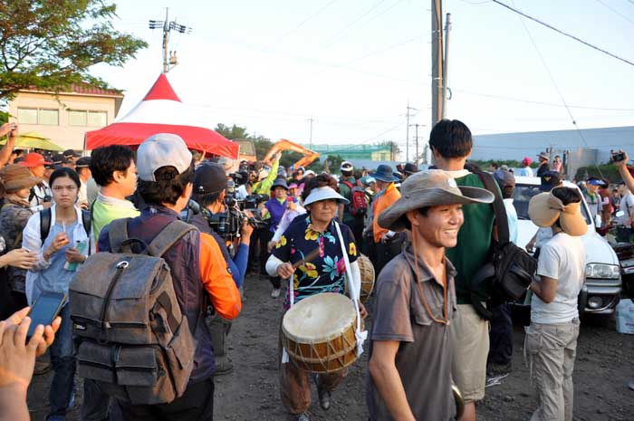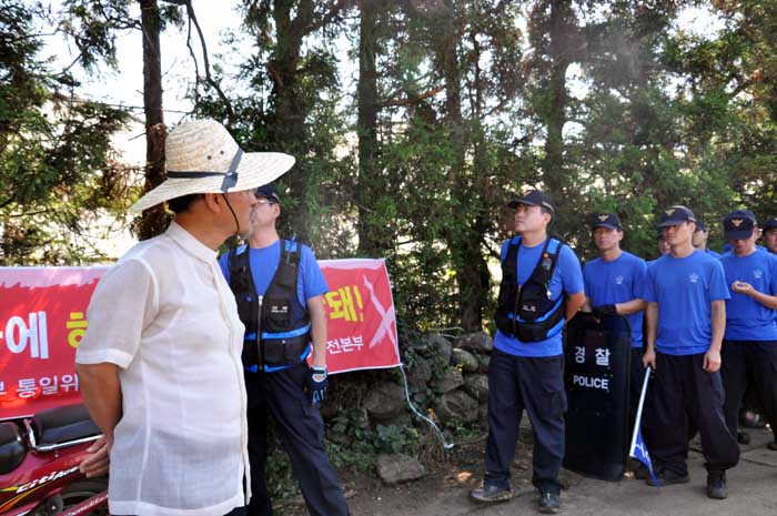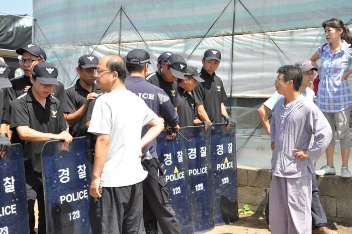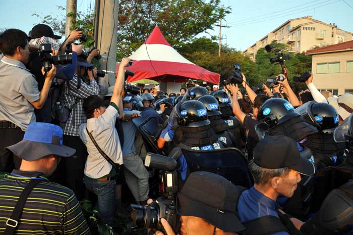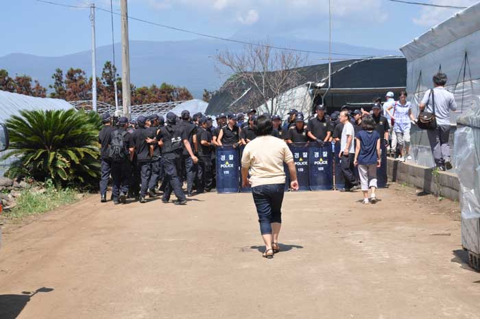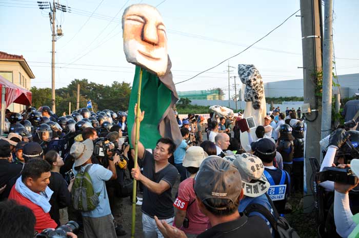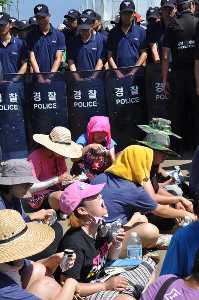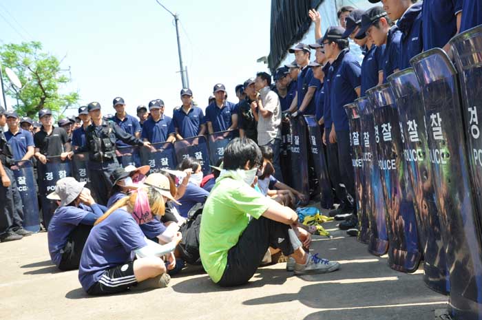 | 座り込みの1日が始まる ●朝6時、「おきろー」という声で、座り込みの1日が始まります。食事を作る人、掃除をする人、それぞれに役割に従って行動しています。集会参加のためにやってきた人たちは、眠たげな眼で、顔をあらっていました。 ●朝食のメニューは、おにぎり、冷たい野菜スープ、キムチでした。 ●座り込みに参加している宗教団体(たぶんキリスト教だと思うのですが)が、朝のお祈りをしています。 ●こちらはソウルから来た大学生の団体です。座り込みをしている人たちに、応援のアピールです。 ●鉄塔の上のコ・グォニル委員長にも、シュプレヒコールでエールを送ります。 ●午前10時30分から記者会見が始まりました。昨日のフェンス建設強行と逮捕に抗議し、基地建設を止めるために座り込みを続ける――という内容のようです。記者会見に参加したのは、民主労働党・進歩新党・民主党などの済州島の責任者です。 ●宣言文を読み上げます。 警察による封鎖強行 ●午後1時30分、大量の警察官が座り込みの場所に侵入し、阻止線を作りました。 ●住民の抗議が始まります。 ●警察に体当たりする女性。 ●午前中に座り込みを訪問したソウルの学生たちが、周辺を見学して戻ってくるところでした。警察の阻止線は、この学生たちを止めるためのものだったようです。1人、2人なら通れるが、団体は通れないという状態が続きます。 ●住民のリーダーが、警察に抗議します。 ●わずか30人程度の女子大学生に対して、200人ちかい警察官が、2重、3重に阻止線を張りめぐらしています。 ●阻止線の合間から、住民が学生たちに、キンパ(韓国の海苔巻)が差し入れられました。 ●警察の盾に寄りかかって、キンパをほおばる学生。 ●警察と住民代表の交渉の末、学生たちは来た道を戻ることになり、警察は分厚い阻止線を解きました。ところが、警官が待機場所に帰るために、座り込みの場所に再度侵入してきたのです。 ●住民や支援者が、警察を止めようとして、あちこちで押し合いが始まります。 ●住民は、座り込み場所への道を、ワンボックスカーとトラックで封鎖し、警察の侵入を押しとどめました。 ●その後も、にらみ合いが続きます。 韓国全土から200人がオルレに参加 ●3日の午後には、済州島の基地建設に反対する全国規模の行動として、「平和よ、歩こう。巡礼に行くか?」が行われました。済州島の外周には、「オルレ」と呼ばれる道が整備されています。「オルレ」は、もともとは、家の門から村道まででる小道の意味のようですが、現在では済州島を一周するトレッキング・コースの呼び名となっています。 この日は、全国の民衆運動・市民運動・労働運動・宗教団体などの関係者200人が済州島を訪れて、オルレ第7コースを歩きました。 ●200人の参加者が、空港から到着しました。 ●歓迎の横断幕や、済州島の民俗お面が、全国からの参加者を出迎えます。 ●韓国平和運動の指導的立場にある、ムン神父から参加者にメッセージ。 ●オルレ第7コース巡礼のスタートです。 ●済州島独特の海岸線を見ながら、参加者は2時間ちかいトレッキングを行いました。 ●到着場所は、「カンジョン運動場」です。ここで、夕方からここで平和コンサートが行われるのです。入口では、カンジョンの女性たちが、出迎えてくれました。 「日本から来ました〜」と挨拶すると、拍手で歓迎してくれました。 ●一般道から運動場へ入る所に突然警察が殺到し、塞いでしまいました。 ●警察が阻止しようとしていたのは、韓国の民俗楽器を手にしたグループでした。 ●主催者が警察に阻止線を解かせて、その間を音楽グループが会場に入ってきす。 ●警察は、いつでも襲いかかれる態勢です。 ●運動場に入った、音楽グループが演奏と歌を始めました。 ●会場の人たちも参加して、輪を作って踊ります。 ●コンサートが始まりました。 ●コンサートは4時間近く続きました。最後に、参加者が「風灯」を空に飛ばします。 |