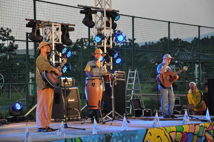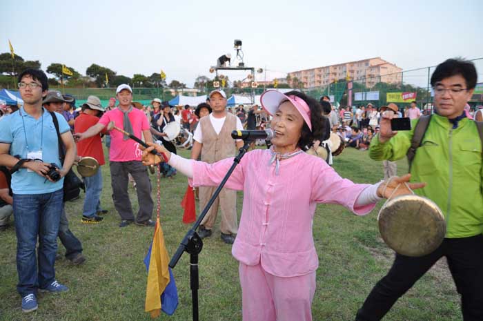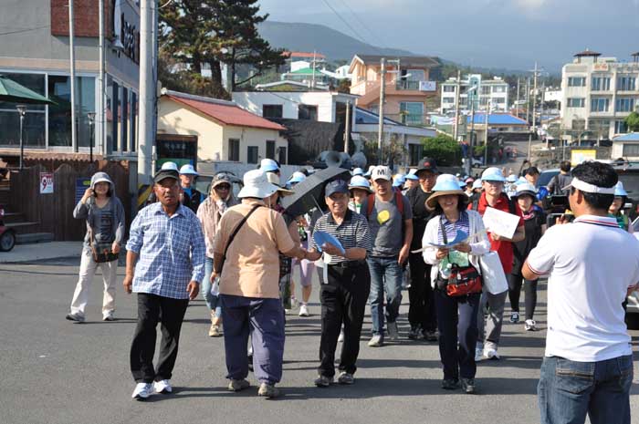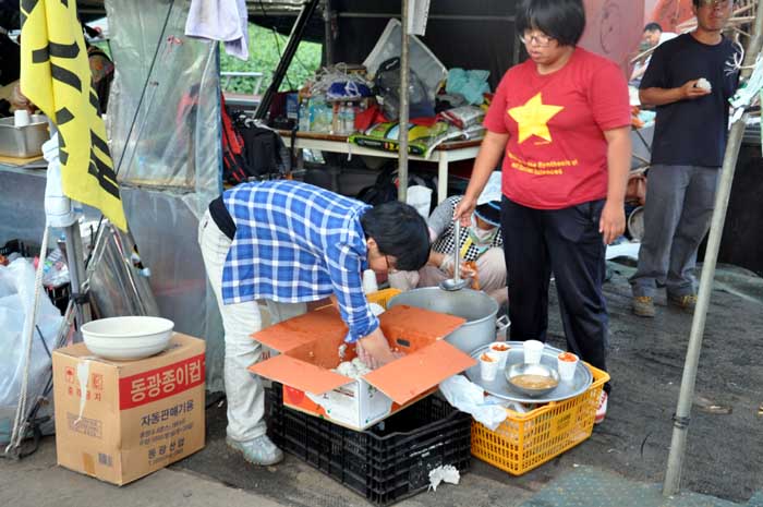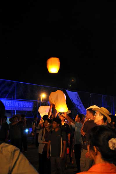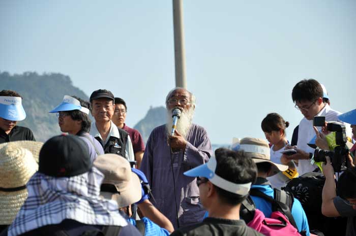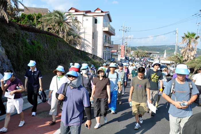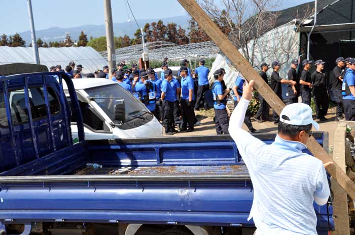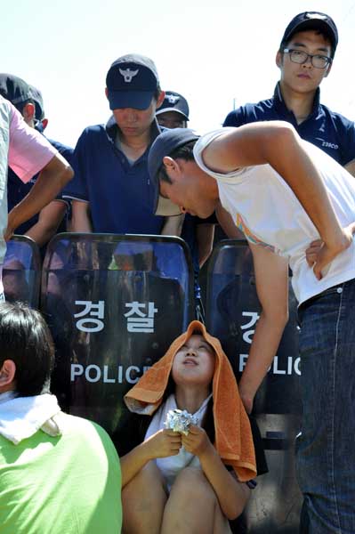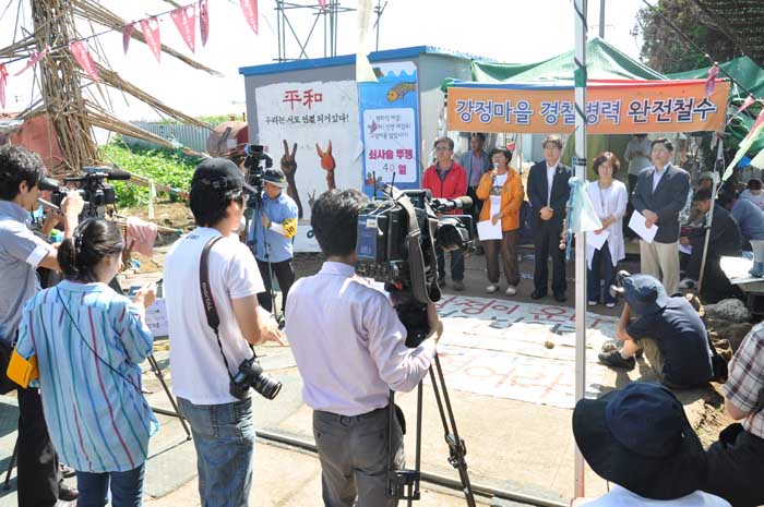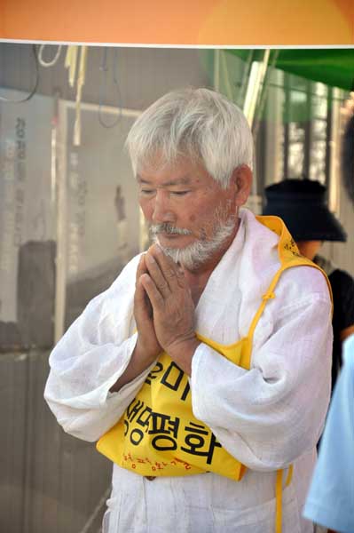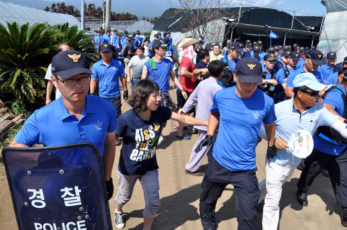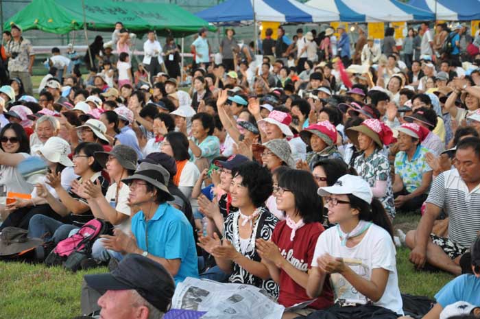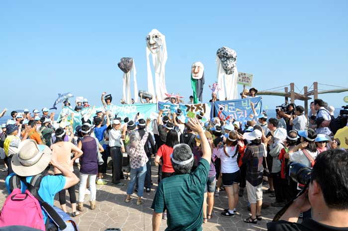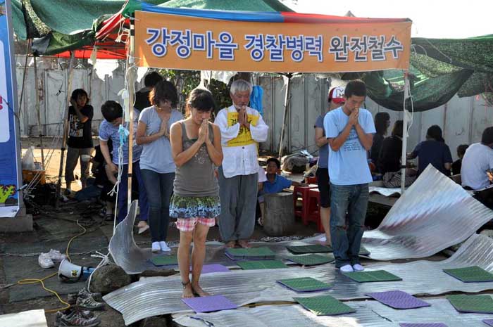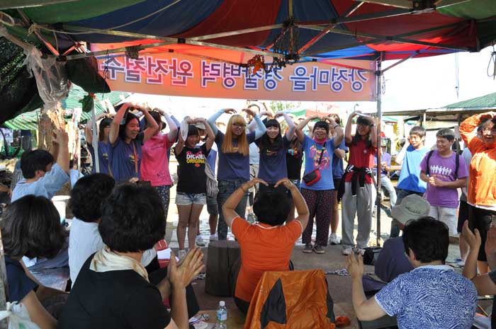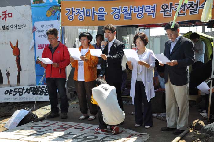 | 座り込みの1日が始まる ●朝6時、「おきろー」という声で、座り込みの1日が始まります。食事を作る人、掃除をする人、それぞれに役割に従って行動しています。集会参加のためにやってきた人たちは、眠たげな眼で、顔をあらっていました。 ●朝食のメニューは、おにぎり、冷たい野菜スープ、キムチでした。 ●座り込みに参加している宗教団体(たぶんキリスト教だと思うのですが)が、朝のお祈りをしています。 ●こちらはソウルから来た大学生の団体です。座り込みをしている人たちに、応援のアピールです。 ●鉄塔の上のコ・グォニル委員長にも、シュプレヒコールでエールを送ります。 ●午前10時30分から記者会見が始まりました。昨日のフェンス建設強行と逮捕に抗議し、基地建設を止めるために座り込みを続ける――という内容のようです。記者会見に参加したのは、民主労働党・進歩新党・民主党などの済州島の責任者です。 ●宣言文を読み上げます。 警察による封鎖強行 ●午後1時30分、大量の警察官が座り込みの場所に侵入し、阻止線を作りました。 ●住民の抗議が始まります。 ●警察に体当たりする女性。 ●午前中に座り込みを訪問したソウルの学生たちが、周辺を見学して戻ってくるところでした。警察の阻止線は、この学生たちを止めるためのものだったようです。1人、2人なら通れるが、団体は通れないという状態が続きます。 ●住民のリーダーが、警察に抗議します。 ●わずか30人程度の女子大学生に対して、200人ちかい警察官が、2重、3重に阻止線を張りめぐらしています。 ●阻止線の合間から、住民が学生たちに、キンパ(韓国の海苔巻)が差し入れられました。 ●警察の盾に寄りかかって、キンパをほおばる学生。 ●警察と住民代表の交渉の末、学生たちは来た道を戻ることになり、警察は分厚い阻止線を解きました。ところが、警官が待機場所に帰るために、座り込みの場所に再度侵入してきたのです。 ●住民や支援者が、警察を止めようとして、あちこちで押し合いが始まります。 ●住民は、座り込み場所への道を、ワンボックスカーとトラックで封鎖し、警察の侵入を押しとどめました。 ●その後も、にらみ合いが続きます。 韓国全土から200人がオルレに参加 ●3日の午後には、済州島の基地建設に反対する全国規模の行動として、「平和よ、歩こう。巡礼に行くか?」が行われました。済州島の外周には、「オルレ」と呼ばれる道が整備されています。「オルレ」は、もともとは、家の門から村道まででる小道の意味のようですが、現在では済州島を一周するトレッキング・コースの呼び名となっています。 この日は、全国の民衆運動・市民運動・労働運動・宗教団体などの関係者200人が済州島を訪れて、オルレ第7コースを歩きました。 ●200人の参加者が、空港から到着しました。 ●歓迎の横断幕や、済州島の民俗お面が、全国からの参加者を出迎えます。 ●韓国平和運動の指導的立場にある、ムン神父から参加者にメッセージ。 ●オルレ第7コース巡礼のスタートです。 ●済州島独特の海岸線を見ながら、参加者は2時間ちかいトレッキングを行いました。 ●到着場所は、「カンジョン運動場」です。ここで、夕方からここで平和コンサートが行われるのです。入口では、カンジョンの女性たちが、出迎えてくれました。 「日本から来ました〜」と挨拶すると、拍手で歓迎してくれました。 ●一般道から運動場へ入る所に突然警察が殺到し、塞いでしまいました。 ●警察が阻止しようとしていたのは、韓国の民俗楽器を手にしたグループでした。 ●主催者が警察に阻止線を解かせて、その間を音楽グループが会場に入ってきす。 ●警察は、いつでも襲いかかれる態勢です。 ●運動場に入った、音楽グループが演奏と歌を始めました。 ●会場の人たちも参加して、輪を作って踊ります。 ●コンサートが始まりました。 ●コンサートは4時間近く続きました。最後に、参加者が「風灯」を空に飛ばします。 |