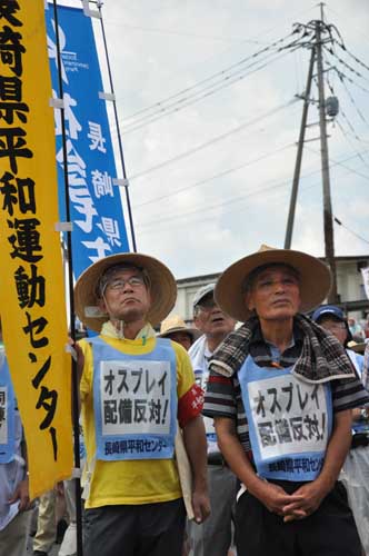 垂直離着陸輸送機MV22オスプレイの沖縄配備阻止も主張。社民県連合代表で、日出生台対策会議の内田淳一議長は「厳しく情報制限されているが、(反対の)声をあげ続けることが必要。世界で最も危険なオスプレイを我々の空に飛ばすわけにはいかない」と力を込めた。【佐野優】