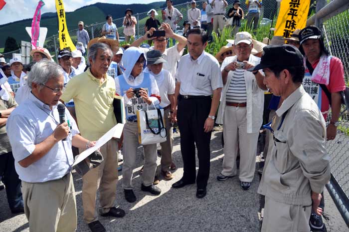 参加者の一部は集会後、日出生台演習場の正門ゲート前に移り、改めて抗議集会を開いた。「オスプレイ配備の撤回を求める要求」と題した森本敏防衛相あての抗議文を九州防衛局の職員に手渡し、「マリーンズ ゴー ホーム(海兵隊は帰れ)」などと大声をあげて抗議の意思を示した。