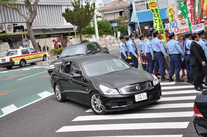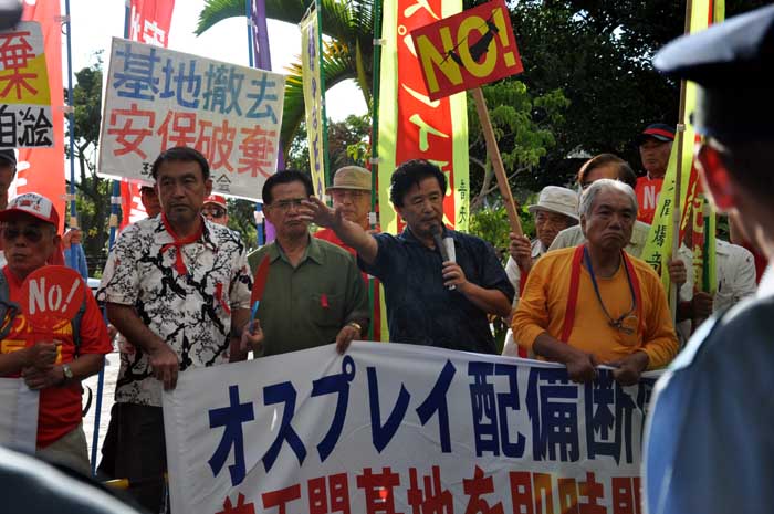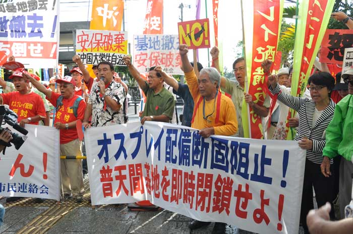 「オスプレイ配備に反対する沖縄県民大会」が10万1000人の参加で成功を収めた2日後の9月11日、森本敏防衛大臣が沖縄を訪れました。沖縄訪問の目的は、沖縄県知事の仲井真弘多さんと、宜野湾市長の佐喜真淳さんに面会し、アメリカのフロリダ州で起きたオスプレイ墜落事故に関する防衛省の分析結果を伝えるためでした。