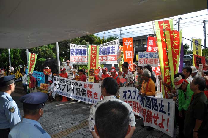 県庁東側の出入り口は、県庁前通りに隣接してT字路のようになっています。人々は3か所にわかれて「森本防衛大臣は帰れ!」と大きな声をあげました。沖縄県警の警察官や県庁の職員が、抗議行動の参加者を規制しています。