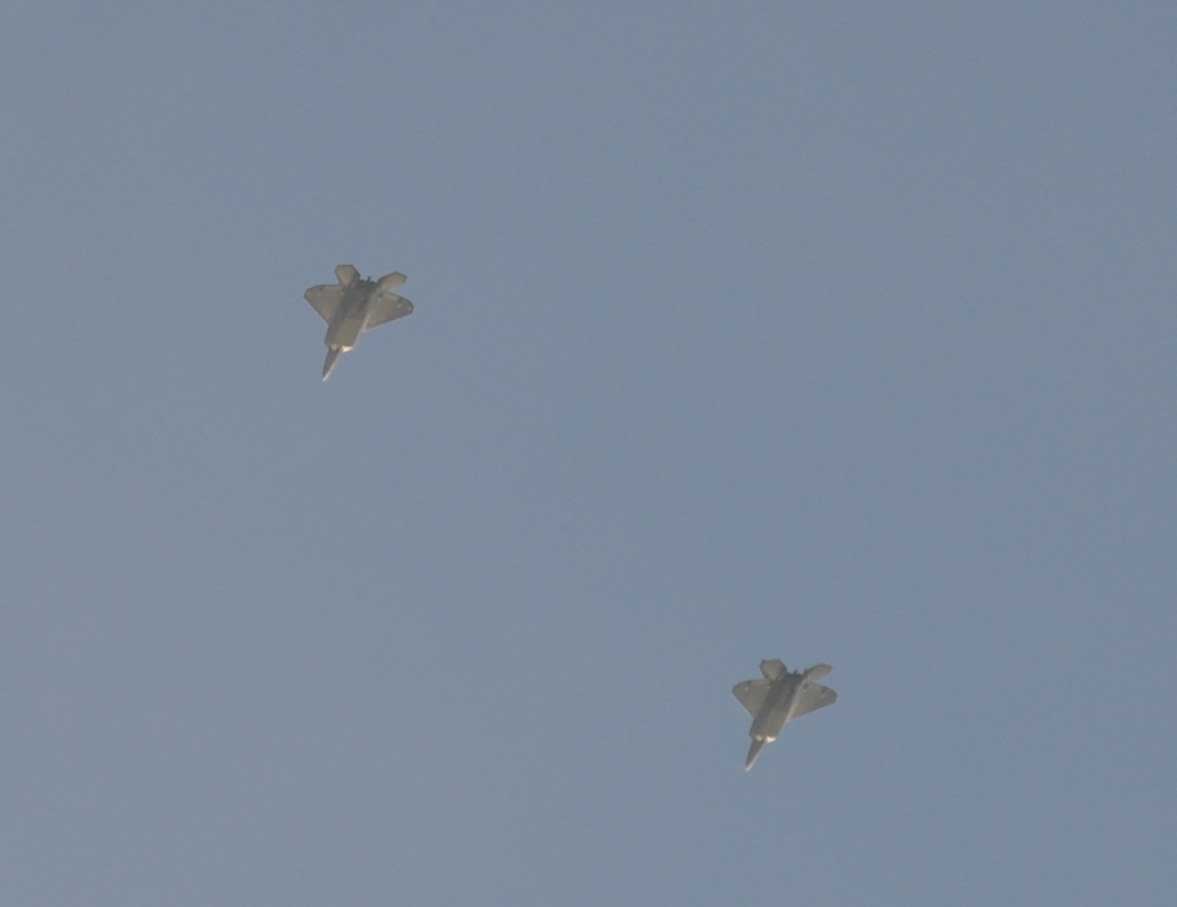 抗議行動中に、大きな爆音がするので見上げると、嘉手納基地に暫定配備されているF−22ラプター戦闘機2機が、市役所の上を通過していきました。