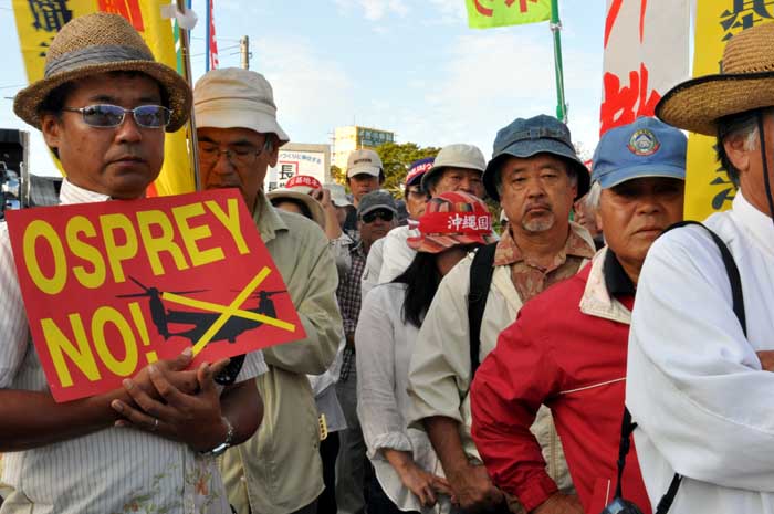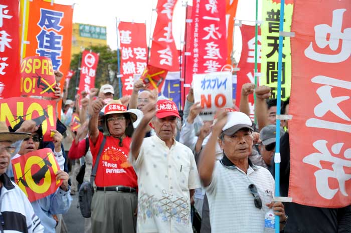 防衛省は9月26日に沖縄県に対して、MV‐22オスプレイを9月28日にも宜野湾市にある海兵隊普天間基地に移転させることを通告しました。オスプレイは7月23日に山口県の海兵隊岩国基地に陸揚げされていましたが、沖縄の人々の強い抗議によって普天間基地に移転することができないでいました。沖縄に上陸した台風の影響によって28日の移転は延期されましたが、10月1日に6機、2日に3機、6日に3機が普天間基地に飛来し、1個飛行隊12機の編成が完了しました。 |
