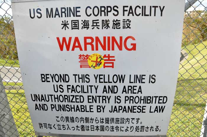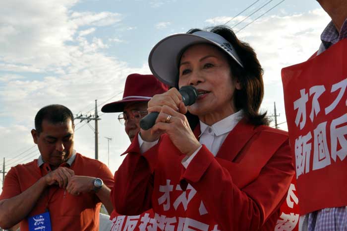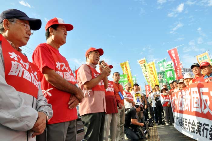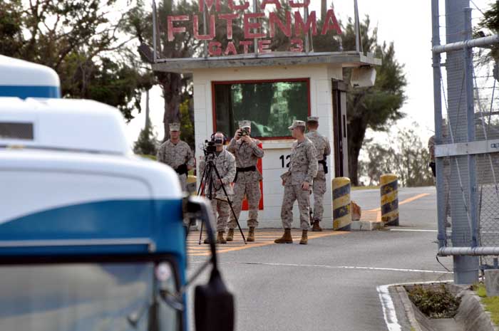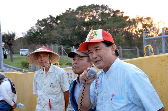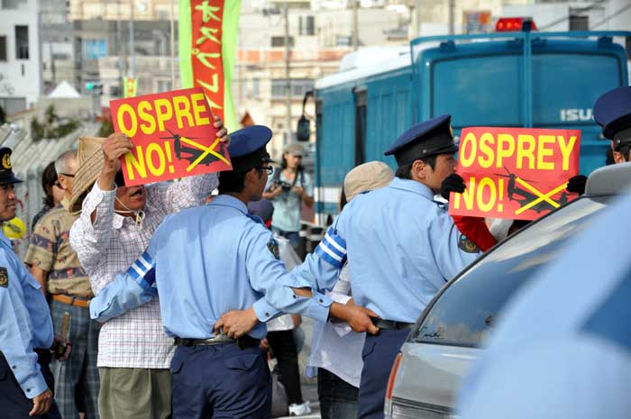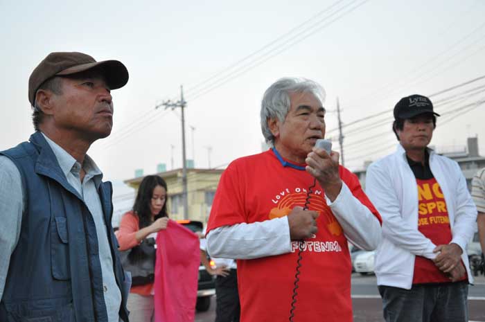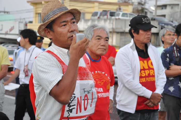 ●「ノー・オスプレイ! マリーン・ゴー・ホーム!」。米兵の車両が出入りするたびに、声をからして叫び続けます。 |