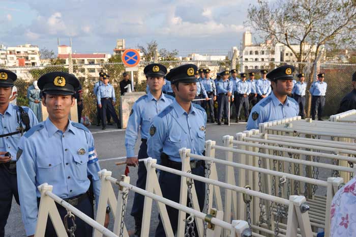 ●ゲートを逆封鎖する沖縄県警の機動隊員たち。 |