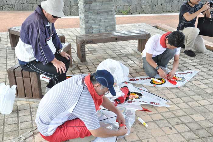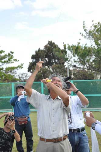 ●1機の値段が50億円から60億円とも言われているオスプレイを、500円の凧で阻止しようと言う試みに、多くのマスコミが取材に来ました。 |