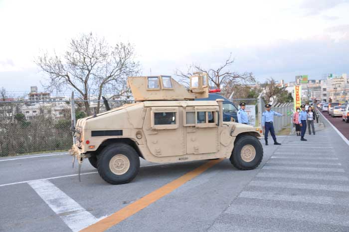 ●急いでウィンドーを閉める、眼を合わせないようにまっすぐ前を見る、うつむく、ニヤニヤしながら見返す・・・。米兵の反応は様々でしたが、自分たちが沖縄に歓迎されていないことは伝わったのではないでしょうか。 |