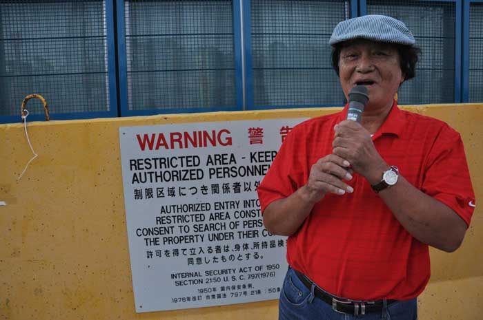 ●ミュージシャンの海勢頭豊(うみせど ゆたか)さん。海勢頭さんはかつて、キャンプ・ハンセンでの実弾砲撃演習抗議行動をテーマにした「喜瀬武原」(きせんばる)という歌を作りました。「オスプレイの配備を止めて、この闘いをテーマにした歌を作りたい」と発言しました。 |