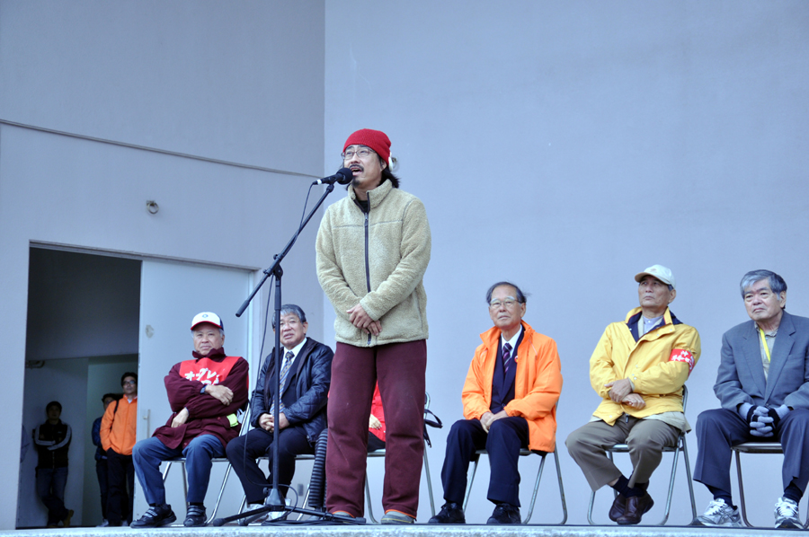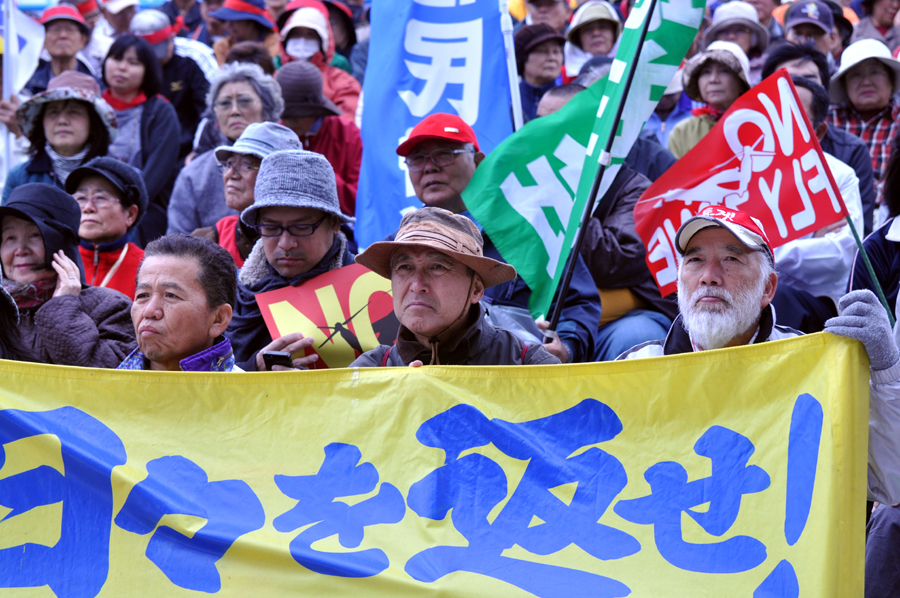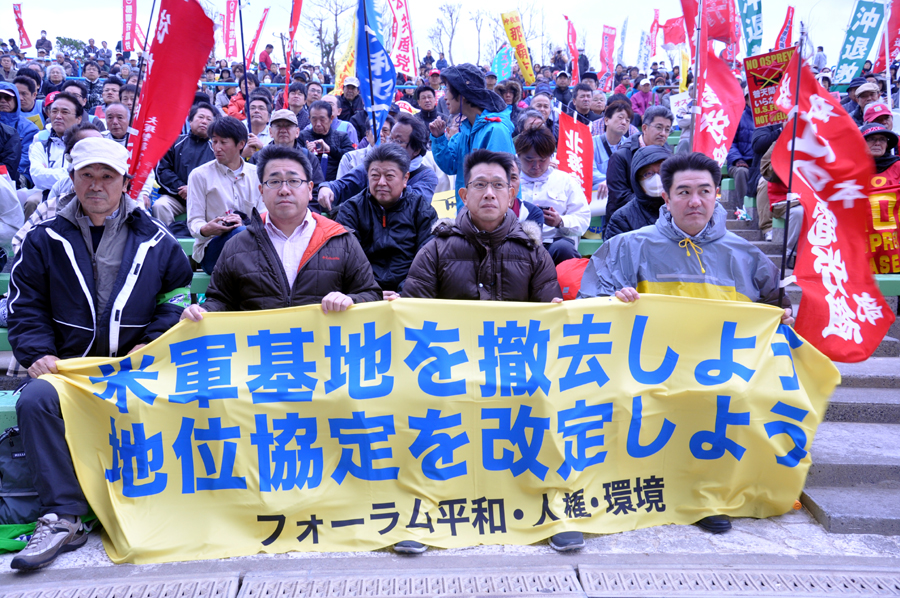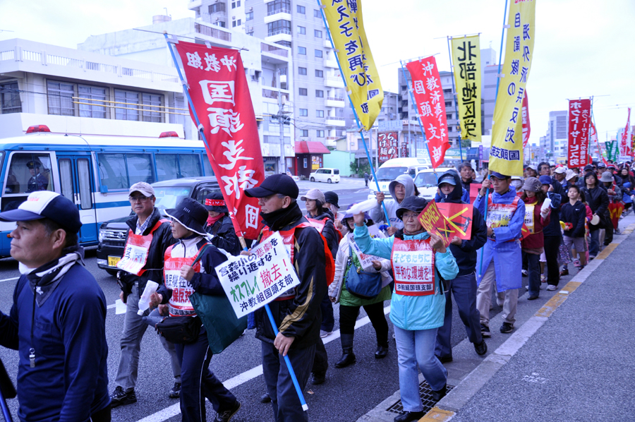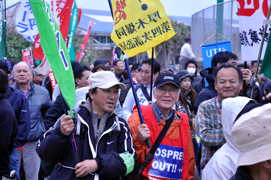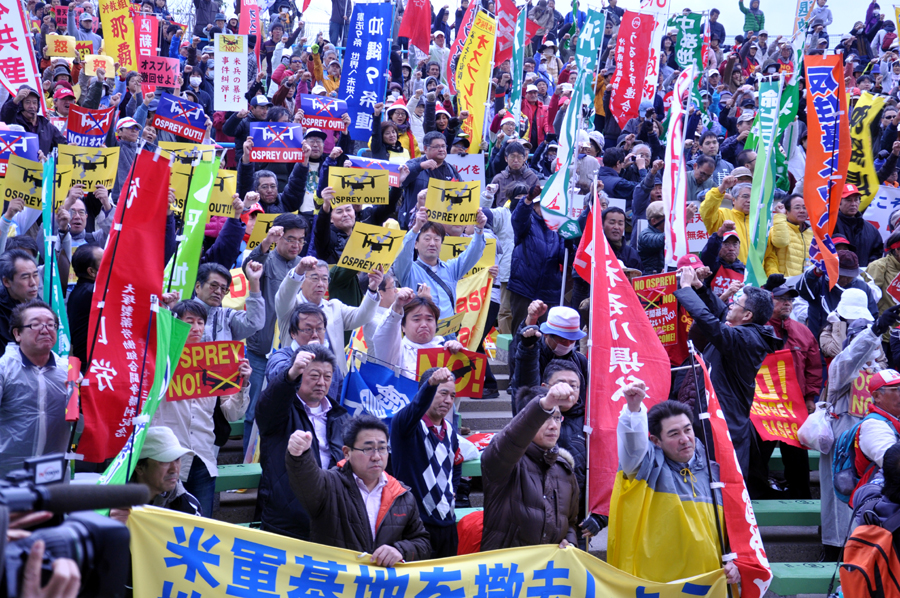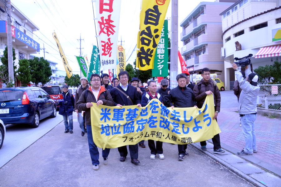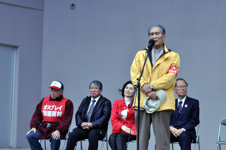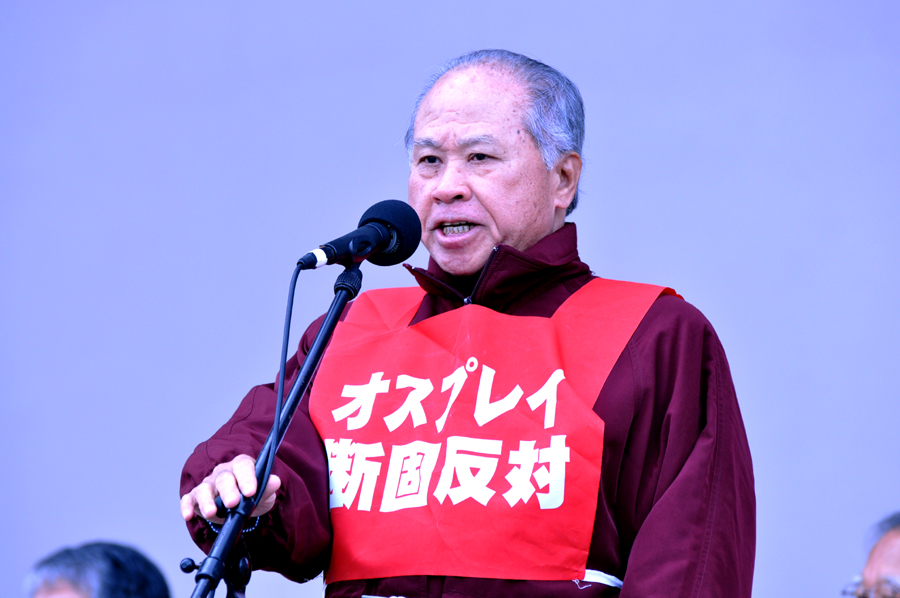 ■司会者あいさつ ●山城博治さん(沖縄平和運動センター事務局長) 今年は基地を巡って、多くのことがありました。県民の思いを踏みにじる、日米両国政府と米軍の蛮行によって、沖縄の魂はいたく傷つけられ、私たちの誇りが踏みにじられようとしています。 オスプレイに対して、県民10万人が抗議しても、県議会が再三にわたって決議を上げても、41市町村議会が決議を上げても、一向に構わない、沖縄に押し付けるのです。そして普天間基地のゲート前に結集した多くの市民を機動隊がごぼう抜きにして、ついに10月1日にオスプレイは配備されました。 今年1年は大きなうねりと闘いに明け暮れた沖縄ですが、今日改めてこの場所に総結集して、私たち県民は決して政府・権力の仕打ちに屈することなく、引き続いて平和を求めて、基地のない沖縄を求めて、闘う決意を固めようと思います。そのような思いで、本日の集会を企画・提案しました。 そうした思いに県内各地から、とりわけオスプレイが配備された普天間から、そして辺野古から、ヘリパット建設に揺れる東村高江から、爆音にさいなまれる嘉手納から、多くの人々が参加しました。また低空飛行訓練に反対する闘いを沖縄で行おうという呼びかけにこたえて、全国各地から多くの仲間が結集しています。心から感謝申し上げます。 ■共同代表団体あいさつ ●崎山嗣幸(沖縄平和運動センター議長・県議会議員・社民党) 「オスプレイ配備撤回・米軍犯罪糾弾・怒りの御万人(うまんちゅ)大行動」に結集された皆さん、大変ご苦労さまです。年末の師走のあわただしい日曜日に、多くの方々がこの運動を停滞させてはいけないという熱い思いで、今日ここに集まっていると思います。 また沖縄の闘いと連帯する思いで、全国の平和フォーラムに参加する仲間が、この場に結集していることにも心から感謝を述べたいと思います。 さて皆さん。オスプレイ反対、あるいは米軍基地反対、辺野古新基地建設反対の思いは、沖縄県民の気持ちが一つになっていることだと思います。この1年間、私たちは多くの運動を展開してきました。9・9県民大会には10万余の県民が結集しました。革新政党や労働組合だけではなく、自民党や公明党、また経済団体まで参加して、沖縄からオスプレイ反対の声を一つの声として、県民の総意として作り上げてきたのです。これは私たちの運動の成果であると、確信することができます。 また先の総選挙においては、残念ながら自民党を中心とする政権を許すことになりました。憲法改正、集団的自衛権の行使など、右傾化する政治の反動に私たちは対決していかなければなりません。本日の集会を契機に、さらに運動を強化し、来年に来るであろうオスプレイを止めて、この普天間基地を撤去させる、諸悪の根源である米軍基地を撤去させるまで、断固として進もうではありませんか。 ■全国からの参加者代表あいさつ ●藤本泰成(平和フォーラム事務局長) ご紹介をいただきました、平和フォーラム事務局長の藤本です。まず初めに、「沖縄では少し寒いかな?」という天気の中で、沖縄から全国から「オスプレイはいらない」、「平和を作るのだ」という熱い思いで結集された皆さんに、心から敬意を表します。 総選挙が終わりました。自民党は選挙の間、沖縄の基地問題には一切触れませんでした。原発の問題にも一切触れませんでした。そうして圧倒的な勝利を得ました。しかしいま、普天間基地を辺野古に移転する、新しい原発を作ると言いだしています。政治は嘘ばかり、私たちを騙してばかりです。沖縄では「わじわじー」というそうですが、本当に腹の立つことばかりです。 アメリカではハワイ州やニューメキシコ州で、市民の反対によってオスプレイを飛ばすことができません。自分の国で作っておいて、自分の国では飛ばすことができない。そうした危険なものを、なぜ人の国で、この沖縄県民の頭の上で、日本の上で飛ばすことができるのでしょうか。そんなことが許されていいはずがありません。そんな理不尽なことがあっていいはずがありません。 皆さん。自民党の改憲案を見たでしょうか。あんな恥ずかしい憲法草案はありません。憲法の中に、「家族は、互いに助け合わなければならない」とあります。こんな憲法がどこにあるのでしょうか。「国民は憲法を守らなければならない」。こんな憲法がどこにあるのでしょうか。「国旗及び国歌を尊重しなければならない」、「公益のためには人権は制限できる」。こんな恥ずかしい憲法、立憲主義というものを自民党政権は誰も分かっていないのです。私たちはこの憲法改正案を、絶対に許してはならない。 沖縄は平和憲法の基に復帰したのであって、日本に復帰したのではありません。そうした思いで沖縄の皆さんと、最後まで闘いっていきたい。 全国から沖縄にやって来た平和フォーラムの仲間を代表して、あいさつとさせていただきます。 ■現地からの報