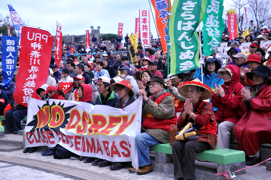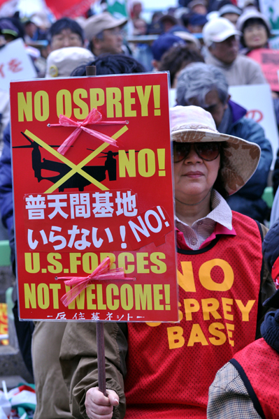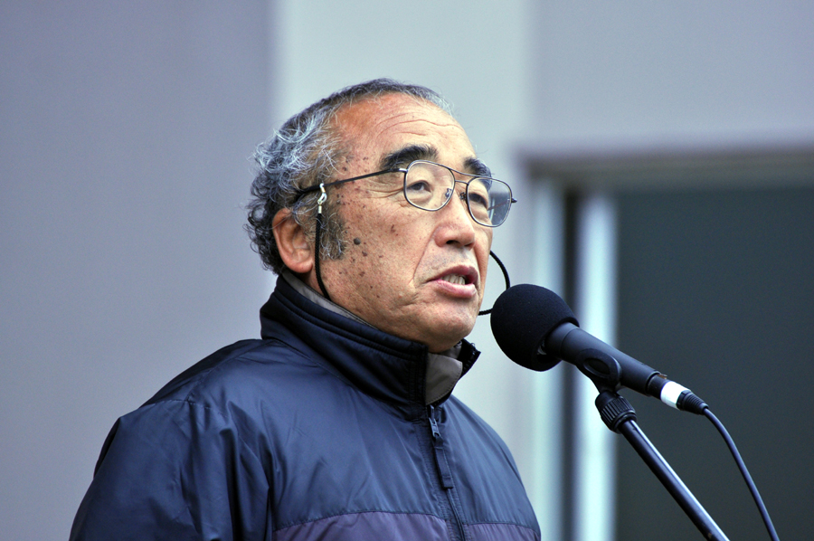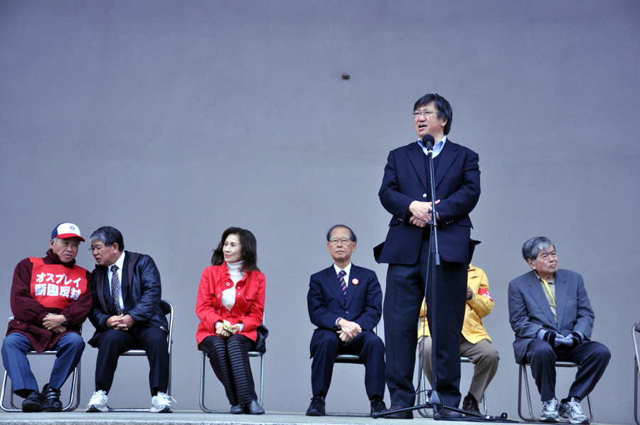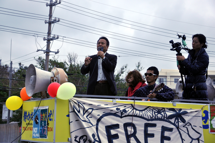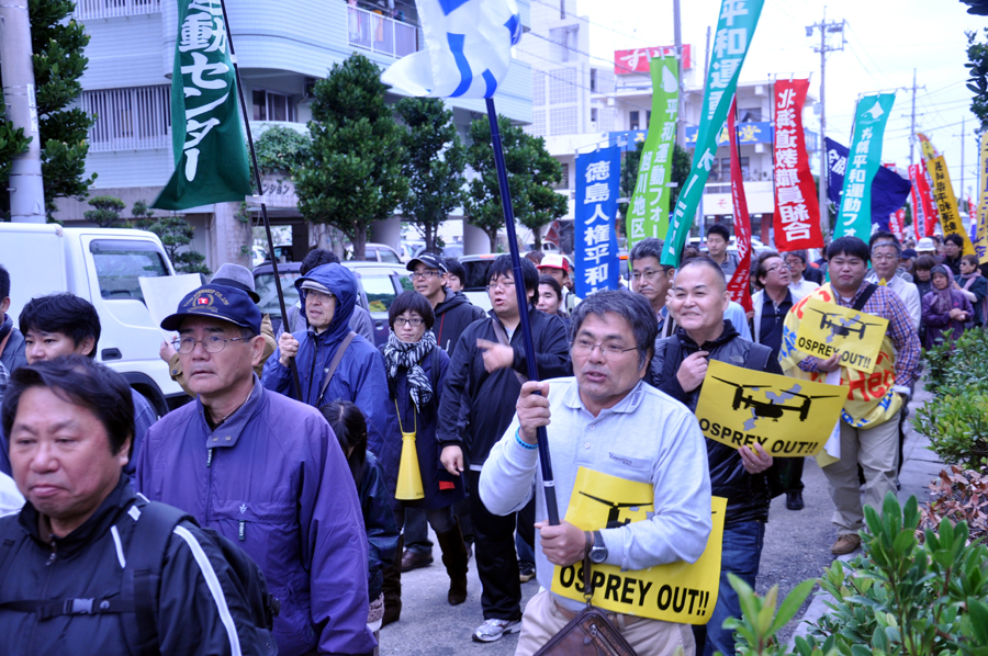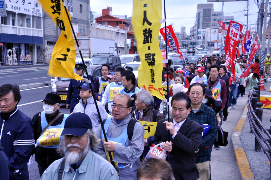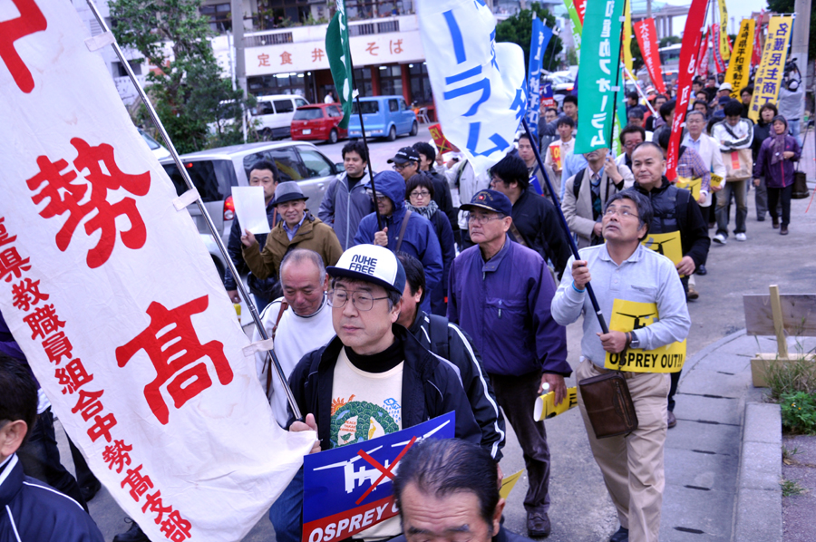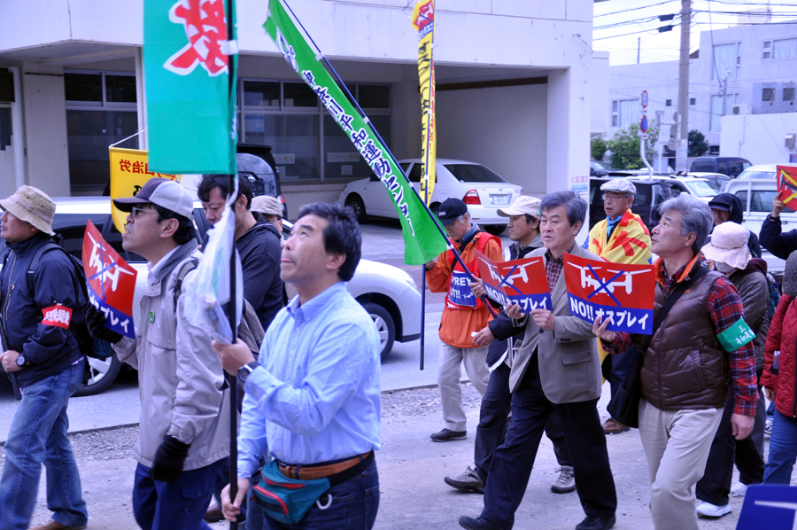 ■司会者あいさつ ●山城博治さん(沖縄平和運動センター事務局長) 今年は基地を巡って、多くのことがありました。県民の思いを踏みにじる、日米両国政府と米軍の蛮行によって、沖縄の魂はいたく傷つけられ、私たちの誇りが踏みにじられようとしています。 オスプレイに対して、県民10万人が抗議しても、県議会が再三にわたって決議を上げても、41市町村議会が決議を上げても、一向に構わない、沖縄に押し付けるのです。そして普天間基地のゲート前に結集した多くの市民を機動隊がごぼう抜きにして、ついに10月1日にオスプレイは配備されました。 今年1年は大きなうねりと闘いに明け暮れた沖縄ですが、今日改めてこの場所に総結集して、私たち県民は決して政府・権力の仕打ちに屈することなく、引き続いて平和を求めて、基地のない沖縄を求めて、闘う決意を固めようと思います。そのような思いで、本日の集会を企画・提案しました。 そうした思いに県内各地から、とりわけオスプレイが配備された普天間から、そして辺野古から、ヘリパット建設に揺れる東村高江から、爆音にさいなまれる嘉手納から、多くの人々が参加しました。また低空飛行訓練に反対する闘いを沖縄で行おうという呼びかけにこたえて、全国各地から多くの仲間が結集しています。心から感謝申し上げます。 ■共同代表団体あいさつ ●崎山嗣幸(沖縄平和運動センター議長・県議会議員・社民党) 「オスプレイ配備撤回・米軍犯罪糾弾・怒りの御万人(うまんちゅ)大行動」に結集された皆さん、大変ご苦労さまです。年末の師走のあわただしい日曜日に、多くの方々がこの運動を停滞させてはいけないという熱い思いで、今日ここに集まっていると思います。 また沖縄の闘いと連帯する思いで、全国の平和フォーラムに参加する仲間が、この場に結集していることにも心から感謝を述べたいと思います。 さて皆さん。オスプレイ反対、あるいは米軍基地反対、辺野古新基地建設反対の思いは、沖縄県民の気持ちが一つになっていることだと思います。この1年間、私たちは多くの運動を展開してきました。9・9県民大会には10万余の県民が結集しました。革新政党や労働組合だけではなく、自民党や公明党、また経済団体まで参加して、沖縄からオスプレイ反対の声を一つの声として、県民の総意として作り上げてきたのです。これは私たちの運動の成果であると、確信することができます。 また先の総選挙においては、残念ながら自民党を中心とする政権を許すことになりました。憲法改正、集団的自衛権の行使など、右傾化する政治の反動に私たちは対決していかなければなりません。本日の集会を契機に、さらに運動を強化し、来年に来るであろうオスプレイを止めて、この普天間基地を撤去させる、諸悪の根源である米軍基地を撤去させるまで、断固として進もうではありませんか。 ■全国からの参加者代表あいさつ ●藤本泰成(平和フォーラム事務局長) ご紹介をいただきました、平和フォーラム事務局長の藤本です。まず初めに、「沖縄では少し寒いかな?」という天気の中で、沖縄から全国から「オスプレイはいらない」、「平和を作るのだ」という熱い思いで結集された皆さんに、心から敬意を表します。 総選挙が終わりました。自民党は選挙の間、沖縄の基地問題には一切触れませんでした。原発の問題にも一切触れませんでした。そうして圧倒的な勝利を得ました。しかしいま、普天間基地を辺野古に移転する、新しい原発を作ると言いだしています。政治は嘘ばかり、私たちを騙してばかりです。沖縄では「わじわじー」というそうですが、本当に腹の立つことばかりです。 アメリカではハワイ州やニューメキシコ州で、市民の反対によってオスプレイを飛ばすことができません。自分の国で作っておいて、自分の国では飛ばすことができない。そうした危険なものを、なぜ人の国で、この沖縄県民の頭の上で、日本の上で飛ばすことができるのでしょうか。そんなことが許されていいはずがありません。そんな理不尽なことがあっていいはずがありません。 皆さん。自民党の改憲案を見たでしょうか。あんな恥ずかしい憲法草案はありません。憲法の中に、「家族は、互いに助け合わなければならない」とあります。こんな憲法がどこにあるのでしょうか。「国民は憲法を守らなければならない」。こんな憲法がどこにあるのでしょうか。「国旗及び国歌を尊重しなければならない」、「公益のためには人権は制限できる」。こんな恥ずかしい憲法、立憲主義というものを自民党政権は誰も分かっていないのです。私たちはこの憲法改正案を、絶対に許してはならない。 沖縄は平和憲法の基に復帰したのであって、日本に復帰したのではありません。そうした思いで沖縄の皆さんと、最後まで闘いっていきたい。 全国から沖縄にやって来た平和フォーラムの仲間を代表して、あいさつとさせていただきます。 ■現地からの報