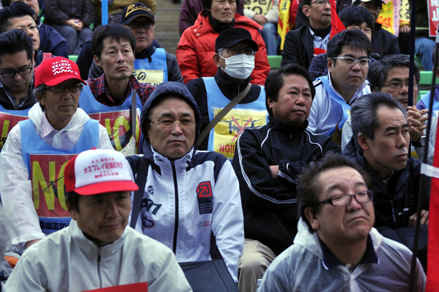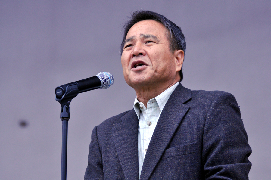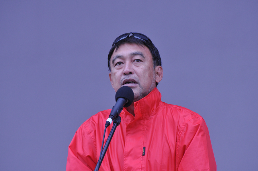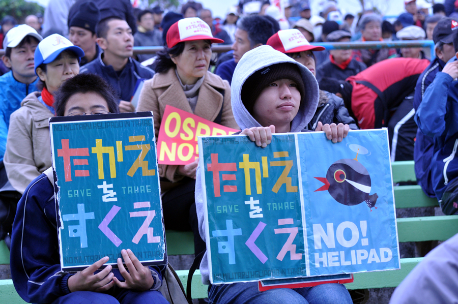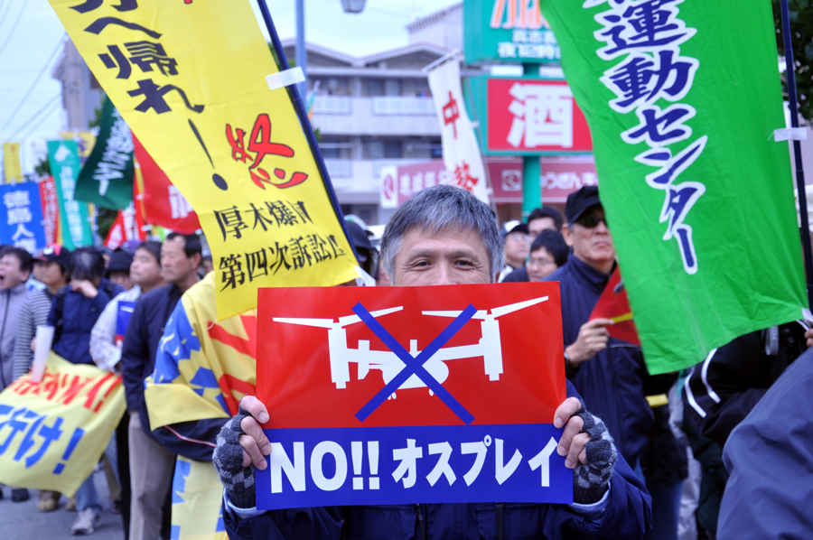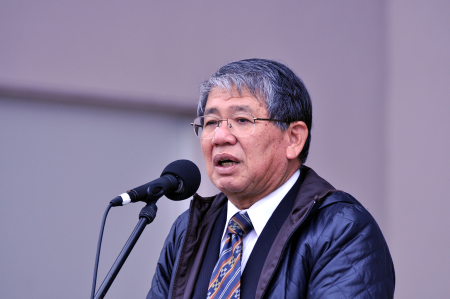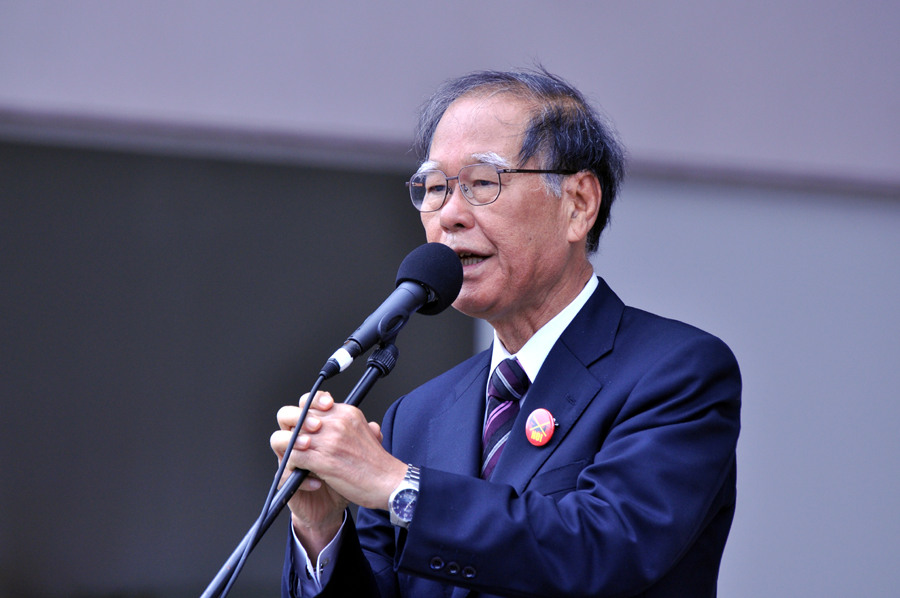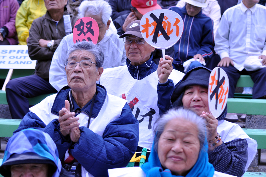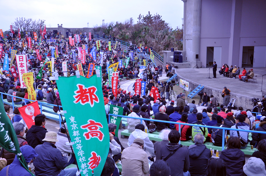 ■司会者あいさつ ●山城博治さん(沖縄平和運動センター事務局長) 今年は基地を巡って、多くのことがありました。県民の思いを踏みにじる、日米両国政府と米軍の蛮行によって、沖縄の魂はいたく傷つけられ、私たちの誇りが踏みにじられようとしています。 オスプレイに対して、県民10万人が抗議しても、県議会が再三にわたって決議を上げても、41市町村議会が決議を上げても、一向に構わない、沖縄に押し付けるのです。そして普天間基地のゲート前に結集した多くの市民を機動隊がごぼう抜きにして、ついに10月1日にオスプレイは配備されました。 今年1年は大きなうねりと闘いに明け暮れた沖縄ですが、今日改めてこの場所に総結集して、私たち県民は決して政府・権力の仕打ちに屈することなく、引き続いて平和を求めて、基地のない沖縄を求めて、闘う決意を固めようと思います。そのような思いで、本日の集会を企画・提案しました。 そうした思いに県内各地から、とりわけオスプレイが配備された普天間から、そして辺野古から、ヘリパット建設に揺れる東村高江から、爆音にさいなまれる嘉手納から、多くの人々が参加しました。また低空飛行訓練に反対する闘いを沖縄で行おうという呼びかけにこたえて、全国各地から多くの仲間が結集しています。心から感謝申し上げます。 ■共同代表団体あいさつ ●崎山嗣幸(沖縄平和運動センター議長・県議会議員・社民党) 「オスプレイ配備撤回・米軍犯罪糾弾・怒りの御万人(うまんちゅ)大行動」に結集された皆さん、大変ご苦労さまです。年末の師走のあわただしい日曜日に、多くの方々がこの運動を停滞させてはいけないという熱い思いで、今日ここに集まっていると思います。 また沖縄の闘いと連帯する思いで、全国の平和フォーラムに参加する仲間が、この場に結集していることにも心から感謝を述べたいと思います。 さて皆さん。オスプレイ反対、あるいは米軍基地反対、辺野古新基地建設反対の思いは、沖縄県民の気持ちが一つになっていることだと思います。この1年間、私たちは多くの運動を展開してきました。9・9県民大会には10万余の県民が結集しました。革新政党や労働組合だけではなく、自民党や公明党、また経済団体まで参加して、沖縄からオスプレイ反対の声を一つの声として、県民の総意として作り上げてきたのです。これは私たちの運動の成果であると、確信することができます。 また先の総選挙においては、残念ながら自民党を中心とする政権を許すことになりました。憲法改正、集団的自衛権の行使など、右傾化する政治の反動に私たちは対決していかなければなりません。本日の集会を契機に、さらに運動を強化し、来年に来るであろうオスプレイを止めて、この普天間基地を撤去させる、諸悪の根源である米軍基地を撤去させるまで、断固として進もうではありませんか。 ■全国からの参加者代表あいさつ ●藤本泰成(平和フォーラム事務局長) ご紹介をいただきました、平和フォーラム事務局長の藤本です。まず初めに、「沖縄では少し寒いかな?」という天気の中で、沖縄から全国から「オスプレイはいらない」、「平和を作るのだ」という熱い思いで結集された皆さんに、心から敬意を表します。 総選挙が終わりました。自民党は選挙の間、沖縄の基地問題には一切触れませんでした。原発の問題にも一切触れませんでした。そうして圧倒的な勝利を得ました。しかしいま、普天間基地を辺野古に移転する、新しい原発を作ると言いだしています。政治は嘘ばかり、私たちを騙してばかりです。沖縄では「わじわじー」というそうですが、本当に腹の立つことばかりです。 アメリカではハワイ州やニューメキシコ州で、市民の反対によってオスプレイを飛ばすことができません。自分の国で作っておいて、自分の国では飛ばすことができない。そうした危険なものを、なぜ人の国で、この沖縄県民の頭の上で、日本の上で飛ばすことができるのでしょうか。そんなことが許されていいはずがありません。そんな理不尽なことがあっていいはずがありません。 皆さん。自民党の改憲案を見たでしょうか。あんな恥ずかしい憲法草案はありません。憲法の中に、「家族は、互いに助け合わなければならない」とあります。こんな憲法がどこにあるのでしょうか。「国民は憲法を守らなければならない」。こんな憲法がどこにあるのでしょうか。「国旗及び国歌を尊重しなければならない」、「公益のためには人権は制限できる」。こんな恥ずかしい憲法、立憲主義というものを自民党政権は誰も分かっていないのです。私たちはこの憲法改正案を、絶対に許してはならない。 沖縄は平和憲法の基に復帰したのであって、日本に復帰したのではありません。そうした思いで沖縄の皆さんと、最後まで闘いっていきたい。 全国から沖縄にやって来た平和フォーラムの仲間を代表して、あいさつとさせていただきます。 ■現地からの報