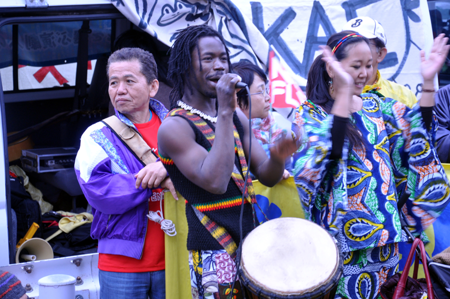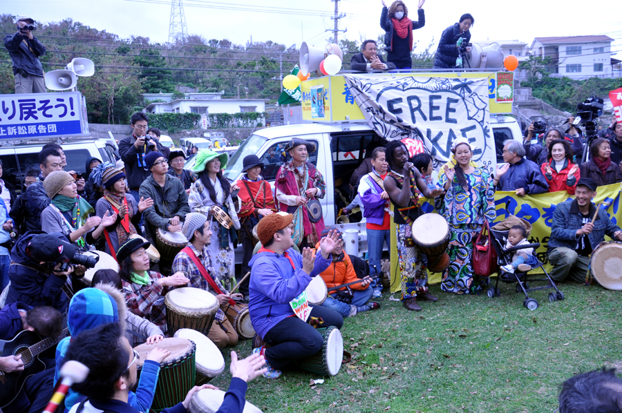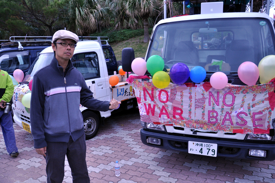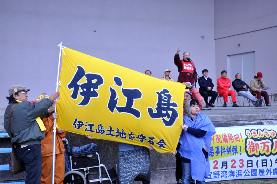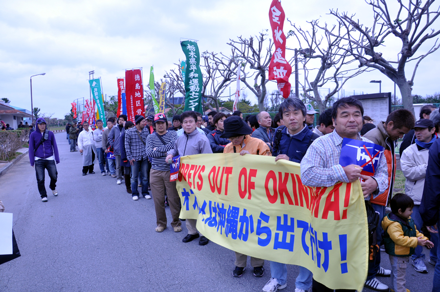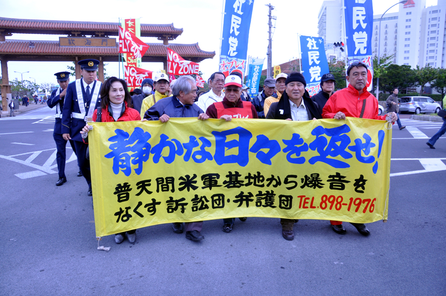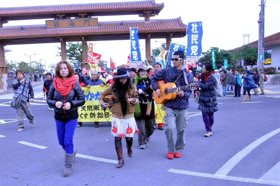 | (はじめに) 沖縄県宜野湾市にある海浜公園野外劇場で12月23日、「オスプレイ配備撤回! 米兵による凶悪事件糾弾! 怒りの御万人大行動」が開催され、約3000人が参加しました。この大行動を企画したのは、沖縄平和運動センター、普天間基地爆音訴訟団、嘉手納基地爆音訴訟団、沖縄平和市民連絡会などが呼びかけた実行委員会です。 これらの団体はオスプレイの普天間基地配備に反対して、9月下旬から基地ゲート前での座り込みを行い、27日から30日にかけては主要なゲートを封鎖に追い込んでいます。オスプレイの撤去を実現するためには非暴力直接行動が重要ですが、一方で多くの県民が気軽に参加できるアピール性の高い行動も必要です。そうした判断から今回の大行動は、沖縄県内のミュージシャンと共同しての「サウンドデモ」を中心としたものになりました。 11時から始まったプレイ集会では、歌手のKEN子さんの司会で、フォークソング、エイサー、沖縄民謡、海勢頭豊さんらによるミニコンサートが行われました。 12時からの本集会では、共同代表団体あいさつ、全国連帯あいさつ、現地報告、政党あいさつなどが行われました。主催者を代表してあいさつに立った沖縄平和運動センター議長の崎山嗣幸さんは、「来年にも来るであろうオスプレイを止めて、この普天間基地を撤去させる、諸悪の根源である米軍基地を撤去させるまで、断固として進もう」と発言しました。 全国参加者を代表して平和フォーラム事務局長の藤本泰成さんは、「ハワイ州やニューメキシコ州では、市民の反対によってオスプレイを飛ばすことがでない。自分の国では飛ばすことができない危険なものを、なぜ人の国で、沖縄県民の頭の上で飛ばすことができるのか。そんな理不尽があってはならない」と訴えました。 普天間基地爆音訴訟団事務局次長の桃原功さんは、「今年1年を表す文字は『金』だった。しかしウチナンチュは、オスプレイの強行配備や、米兵による暴行事件に対して『怒』の文字しか思い浮かばない」、「来年こそは撤退の『退』を1年の文字として表したい」と話しました。 ヘリ基地反対協共同代表の安次富浩さんは、「いま野篙ゲートと大山ゲートで基地封鎖、アメリカ兵は帰れという闘いが続けられている。アメリカの軍隊がいやすい環境の沖縄を、私たちは拒否しよう。アメリカ軍が沖縄から出ていく闘いを、私たちの手で作ろう」と檄を飛ばしました。 集会終了後、参加者は10グループに分かれて、普天間基地の大山ゲートまでデモ行進を行いました。それぞれのグループは、三線、チャンゴ、ロックやフォーク、クラブミュージックなどのミュージシャンが先頭になって、音楽を奏でながらの行進となりました。 平和フォーラムは加盟組織に大行動への参加を呼びかけ、全国各地から約130人が参加しました。 以下は本集会での発言要旨と、写真リポートです。 |