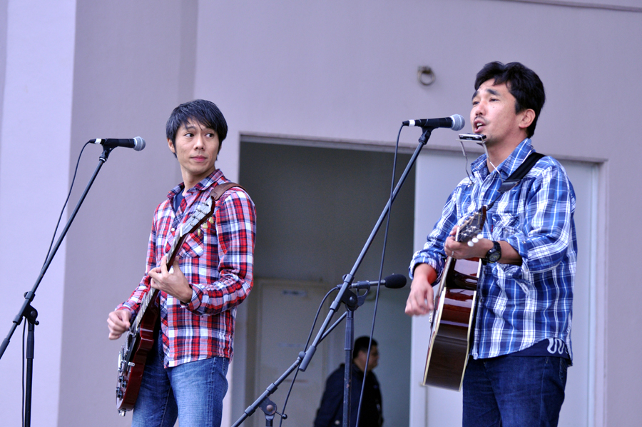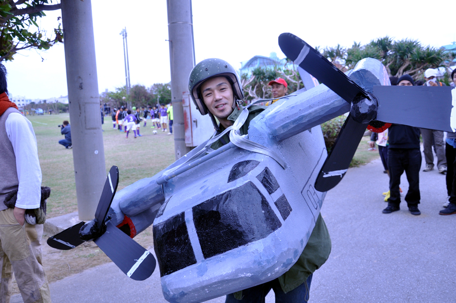 ●野外劇場の外では、ミュージシャンの皆さんが、サウンドカーのデコレーションなど、準備を進めていました。 ●お手製のオスプレイに乗った人も。 |