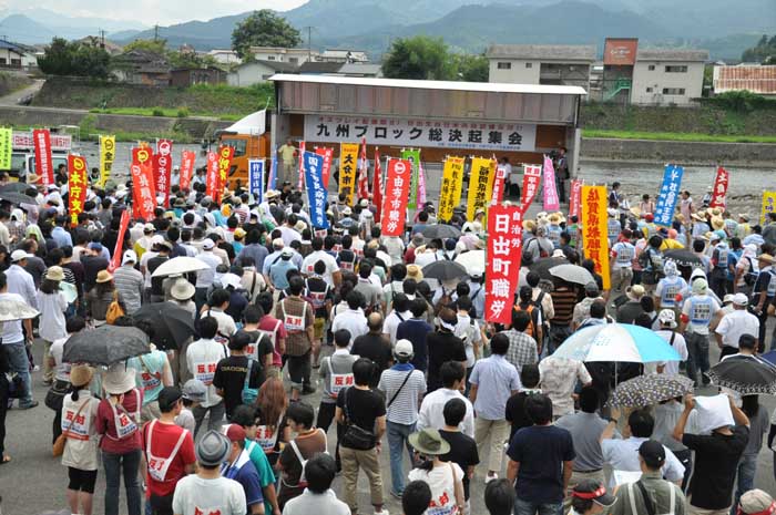 | 「オスプレイ沖縄配備阻止!」「日出生台日米共同訓練反対!」 九州ブロック総決起集会 ●2012年8月18日(土)13:00~ ●大分県玖珠町 / 日出生台演習場ゲート前 ●玖珠川河川敷には九州各県から2000人を超える人々が集まりました。 『「オスプレイ沖縄配備阻止!」「日出生台日米共同訓練反対!」九州ブロック集会』が8月18日午後、大分県玖珠町の玖珠川河川敷で開かれました。主催は日出生台対策会議と九州ブロック労組連絡会議です。集会には地元大分県をはじめとして九州各県から、2000人を超える人々が集まりました。 ●司会 河野泰博さん(大分県平和運動センター事務局長) 集会は河野さんの司会で始まりました。河野さんは9月9日には沖縄県民大会が開かれる。九州各県からも積極的に参加しよう。日米安保破棄を実現しようと、力強く訴えました。 ●主催者あいさつ 内田淳一さん(日出生台対策会議議長) 政権交代から、まもなく3年が経とうとしています。自民党政権に代わって誕生した民主党政権に対して、私たちは大きな期待を持ったことは事実であります。 しかし、そのことごとくが裏切られ、いまや失望の中におかれていると言っても過言ではありません。 そうした中で特に目に余るのが、アメリカ追従外交だと考えています。中でも防衛問題は、アメリカのいいなりです。日本の主権は、いったいどこにあるのでしょうか。野田総理や森本防衛大臣の言動を見るにつけ、聞くにつけ、そう感じているのは皆さんも同じではないでしょうか。 その象徴の一つとして、日米共同訓練が明日から日出生台で行われることになりました。日出生台は毎年毎年、海兵隊による155ミリりゅう弾砲の演習が行われています。5年1回、海兵隊が演習をしない年がありますが、今年がその年に当たります。ところがそこに、共同訓練が入って来ました。今回で5回目です。 今回の演習の内容は何か、どれだけの兵員が来るのか、いつ装備が送られてくるのか、兵員はどのようなルートで日出生台に来るのか、全てのことが公開されていません。未だかつてない情報制限であります。このように秘密裏に演習が行われています。 日出生台を沖縄に続く基地にしないために、これまで行動をしてきました。そしてまた情報公開を求めてきました。地域住民の安心・安全を守るために要求してきました。しかし我々の要求を、防衛省・防衛局は、聞くだけで何も進展がありません。しかし、こうして声を上げ続けることが、何としても必要であると思います。 日出生台はいま、緑にあふれています。農業に携わる皆さんは、日出生台で牧草を刈り、牛を放牧して生活をしています。最も大切な時期に、なぜ演習を行うのか。何も回答は出されていません。 オスプレイの配備の問題も、連日報道で伝えられています。既に岩国に機体が搬入され整備されて、政府のいうことにはまもなく、沖縄の普天間基地に配備すると言うことであります。沖縄県民の皆さんが、どういう思いでこの報道を見ているのでしょうか。察するに余りあります。 私たちは、世界で最も危険な軍用機であるオスプレイの配備を認めることはできません。オスプレイが配備されると、岩国基地に飛んできて、そこから全国6ルートで演習すると言われています。福岡・熊本・宮崎・大分を結ぶイエロールートでも、夜間飛行訓練や低空飛行訓練が行われるようです。このような危険なオスプレイを、私たちの空に、飛ばすわけにはいかないのであります。 こうした厳しい事態を受け止めて、何としてもこの2つの問題に対していきたいと思います。 わが国は国民の思いとは異なる方向に歩みを進めています。憲法を変えて、軍備を増強しても、平和を守ることはできません。私たちはこうした動きに、断固抗議するために、強い怒りを込めて本日の集会を開催したのです。思いを共有し、闘いを拡げることになればと主催者として決意するところです。がんばりましょう。 ●主催者あいさつ 梶原正実さん(九州ブロック労組連絡会議代表) 九州各県から、また大分県内から結集した皆さん。大変お疲れ様です。 以前、玖珠町での反対集会に来た時に、色々な方からお話を伺いました。農業についてもお聞きしました。なぜこの大切な日出生台に米軍が来て演習をするのかというお話でした。 ところが今回は米軍だけではありません。自衛隊もやってきて、日米合同演習をやる。軍事訓練をやる。いま話がありましたが、牧畜をされている方たちには、大切な時期です。その住民の生活を守らないで、どこに向いて軍事訓練を行おうというのでしょうか。日本政府は間違った方向に進んでいます。 オスプレイを、沖縄県の普天間基地に配備すると言うます。7月に沖縄に行ってきました。普天間基地前で座り込みをしている皆さんを激励しました。普天間基地の周辺には多くの住宅があり、小学校・中学校・幼稚園・保育園があります。そんな中に、この危険なオスプレイを配備する