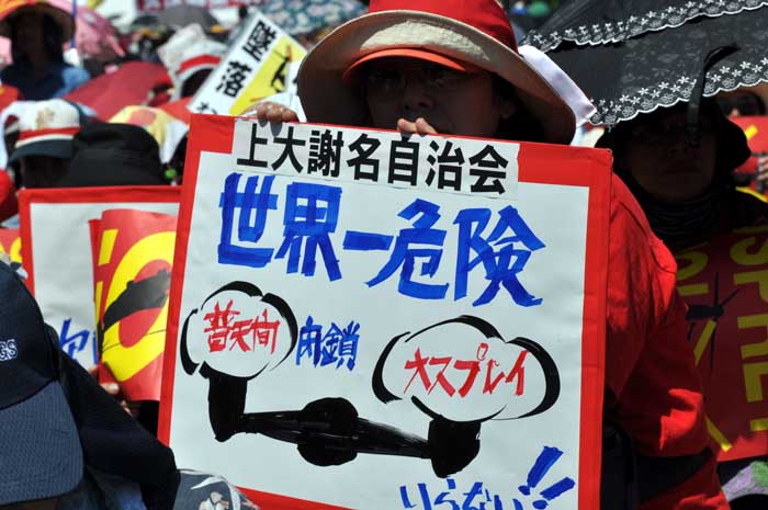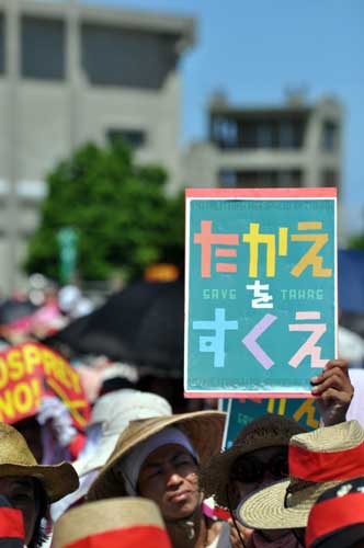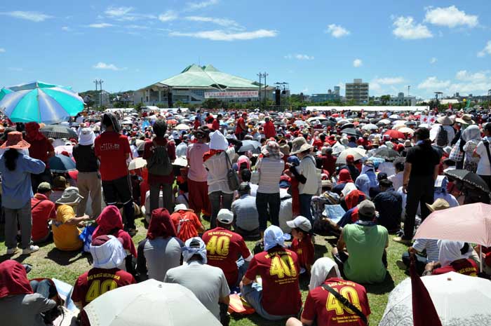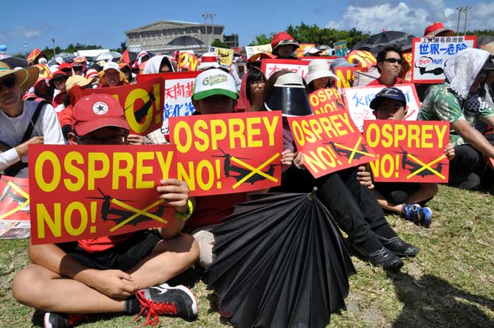沖縄県宜野湾市の海浜公園で9月9日、「オスプレイ配備に反対する沖縄県民大会」が開かれました。この大会は、県議会の各会派を中心に、県内の市町村長、労働組合、経済団体、各種社会団体が共同して開催したものです。炎天下の会場には10万1000人が集まり、オスプレイの沖縄配備に反対する県民の意思を示しました。 |