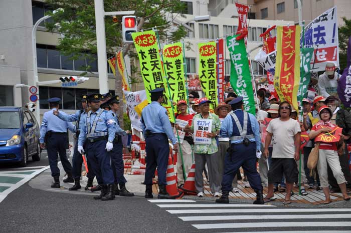 県庁東側の出入り口は、県庁前通りに隣接してT字路のようになっています。人々は3か所にわかれて「森本防衛大臣は帰れ!」と大きな声をあげました。沖縄県警の警察官や県庁の職員が、抗議行動の参加者を規制しています。 |