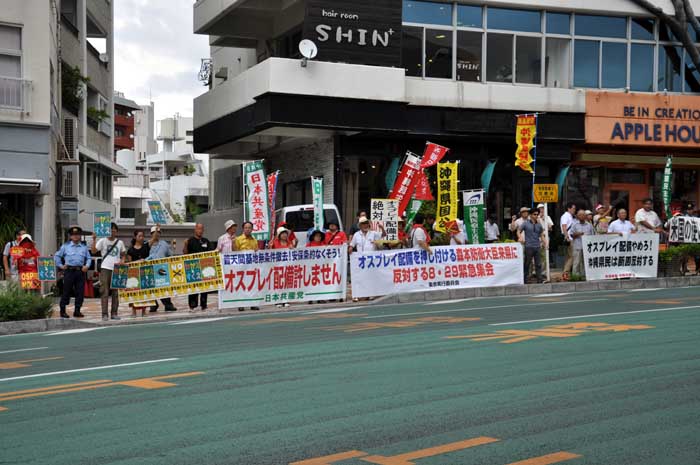| 2012年9月 沖縄活動報告 その3 森本敏防衛大臣の沖縄訪問に抗議 ●日時 2012年9月11日 ●場所 沖縄県那覇市県庁前 沖縄県宜野湾市市役所前 「オスプレイ配備に反対する沖縄県民大会」が10万1000人の参加で成功を収めた2日後の9月11日、森本敏防衛大臣が沖縄を訪れました。沖縄訪問の目的は、沖縄県知事の仲井真弘多さんと、宜野湾市長の佐喜真淳さんに面会し、アメリカのフロリダ州で起きたオスプレイ墜落事故に関する防衛省の分析結果を伝えるためでした。 |
