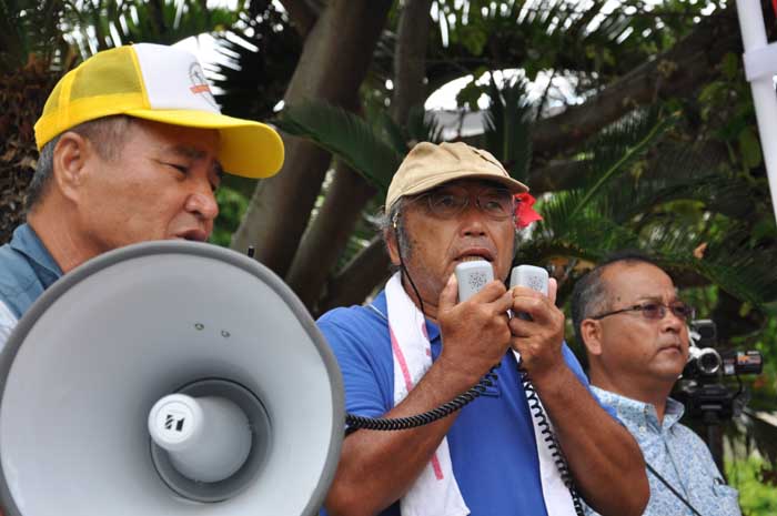 参加した各種団体の代表者が、マイクを握って抗議の声をあげました。 写真は沖縄平和運動センター議長で県議会議員の崎山嗣幸さん。 |
