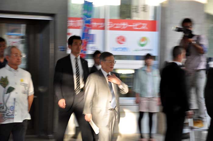 | 市長との話し合いを終えて、庁舎の外に出てくる森本大臣。(ピンボケです。) |