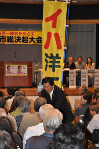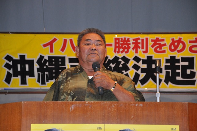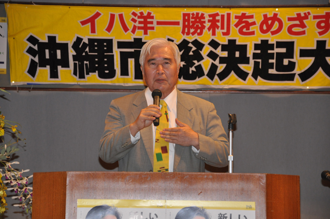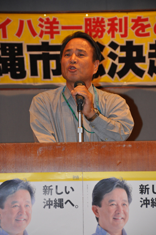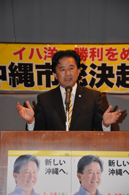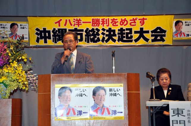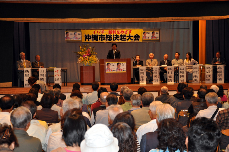 沖縄県知事選挙公示日前日の11月10日、沖縄市で「イハ洋一勝利をめざす沖縄市総決起大会」が開かれました。主催はイハ洋一後援会沖縄支部で、会場には支持者350人以上が集まりました。総決起大会では、伊波洋一さんを推薦している社会民主党・社会大衆党・日本共産党の代表があいさつ。続いて、大きな拍手の中を会場入りした伊波洋一さんが、政策を発表するとともに、選挙勝利にむけた決意を表明しました。