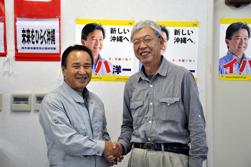 こうした中、東京平和運動センター事務局長の関久さんが、1週間の日程で沖縄入りしました。山城さんと、がっちり握手です。