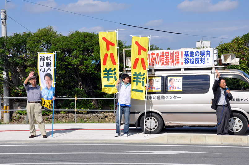 平和フォーラム・全国基地ネット・沖縄平和運動センターの街頭宣伝隊は本日、沖縄県の南部地域にあたる八重瀬町と南城市に向かいました。南部地域は伝統的に保守系の地盤で、15日に紹介した「琉球新報」の記事でも「仲井真氏が大票田の那覇市で先行し、本島南部でも勢いがある」と報じられています。