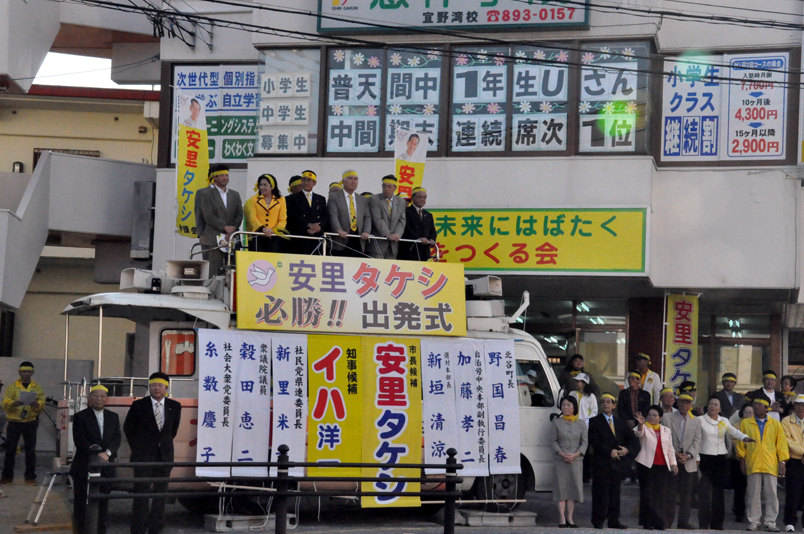 21日9時から後援会事務所前で行われた出発式では、安里さんを推薦する3党の代表や、イハ洋一さん、推薦団体の代表があいさつしました。
