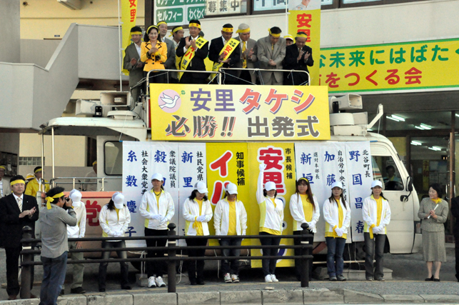 出発式には支持者約500人が参加。安里さんは大きな拍手の中で、演説し、街頭宣伝に出発しました。