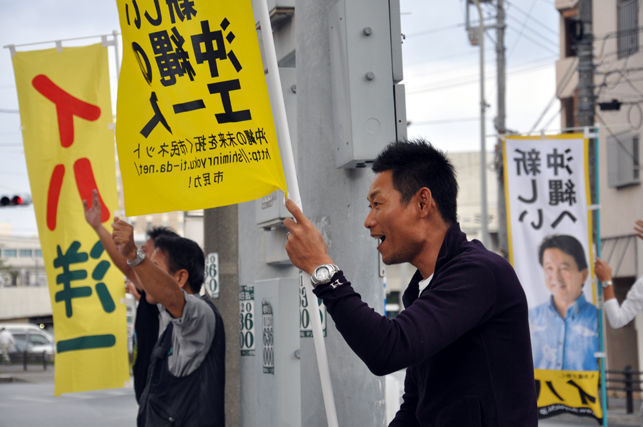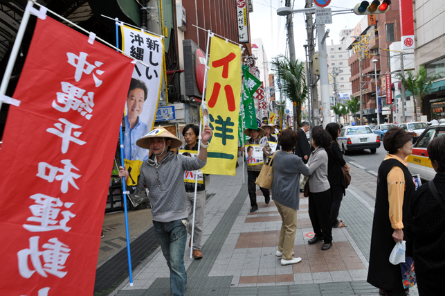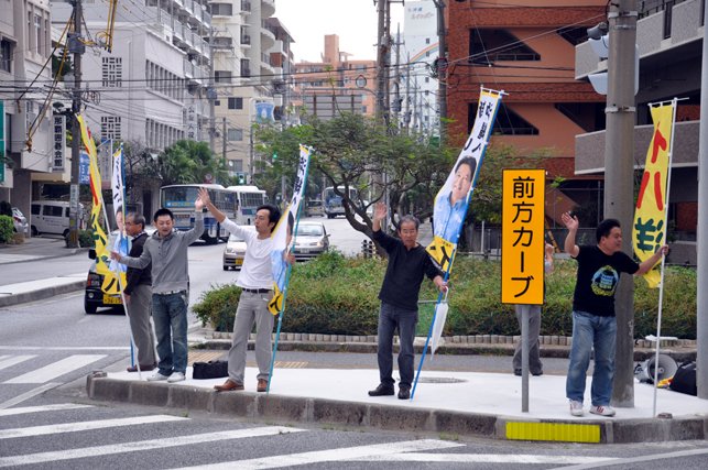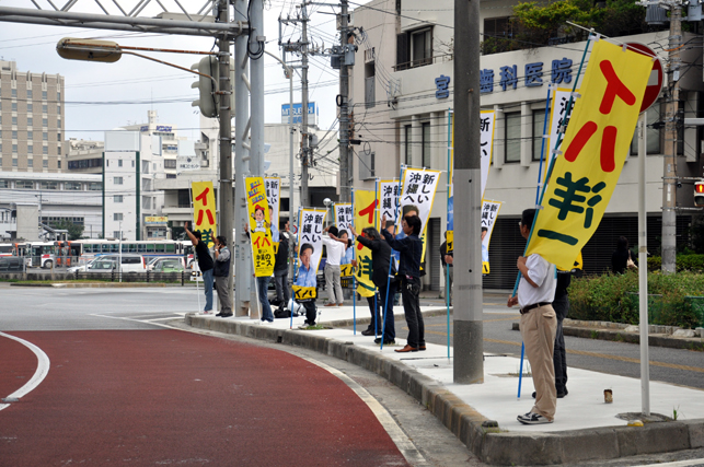 沖縄支援行動・集中行動日の11月23日、全国から集まった15人が那覇市内で街頭宣伝を行いました。早朝7時30分からは、那覇市バスセンター前の交差点で、道行く人々や車両にアピール。その後は国際通りを、基地の撤去を訴えながら練り歩きました。以下は写真レポートです。
