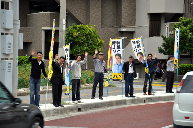 ●早朝行動は毎日7時30分から、バスセンター前で行っています。行きかう車に訴える参加者の皆さん。