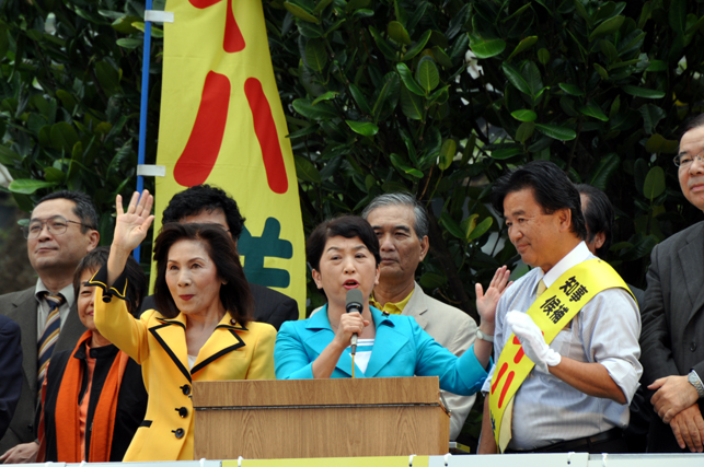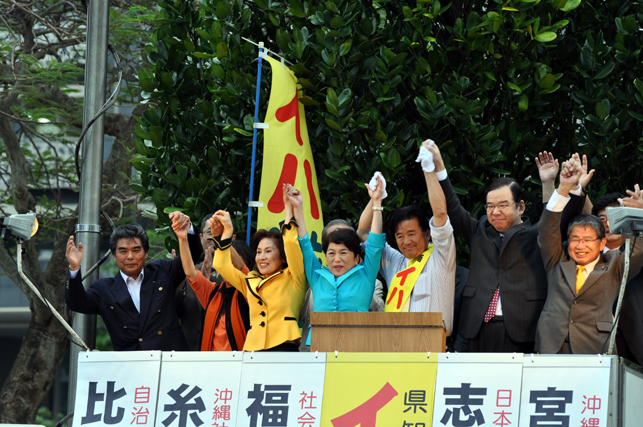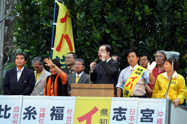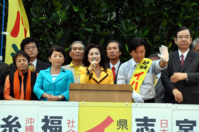 沖縄県那覇市県庁前公園で11月23日午後、イハ洋一さんの県知事選必勝をめざす政談演説会が開かれました。この演説会にはイハ洋一さんを推薦する3政党から、社民党党首で参議院議員の福島みずほさん、社会大衆党委員長で参議院議員の糸数慶子さん、共産党委員長で衆議院議員の志位和夫さんがそろい踏みし、イハ洋一さんへの支援を訴えました。