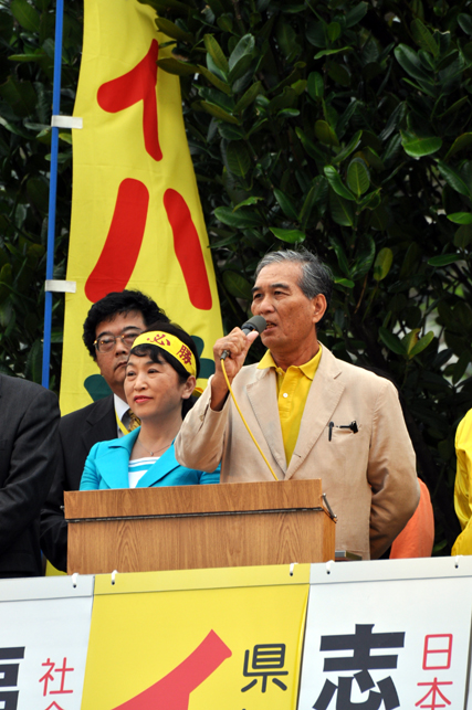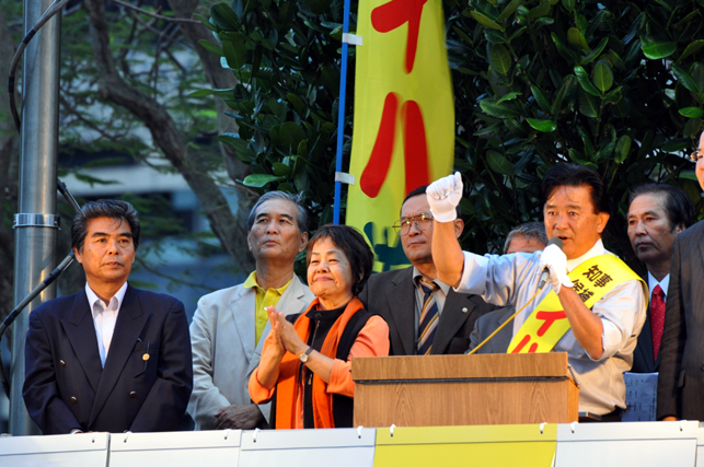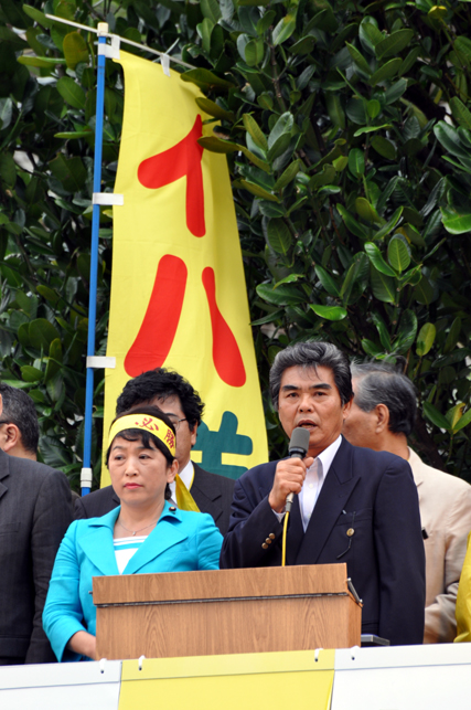 イハ勝利のために集まった県民の皆さん、ご苦労様です。今度の知事選挙は、小泉構造改革に追従した現在の県政が、多くの分野で破壊した県民生活を立て直し、沖縄の自立を求めていく選挙です。