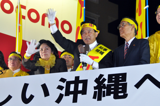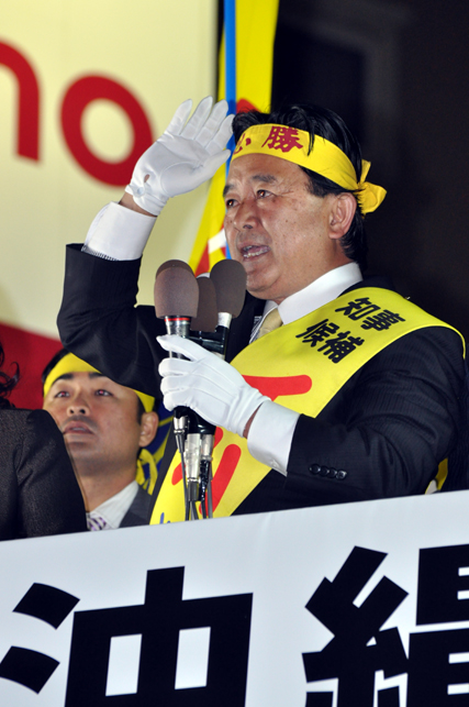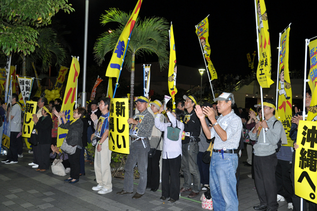 ここおもろまちは、20数年前までは米軍基地でした。それがいまは、那覇市の新都心として見事に発展しています。県民は自らの力で、新しい経済を作り上げる力があるのです。国に頼らない、沖縄県を皆で作りましょう。明日28日を、沖縄県が変わる日、沖縄県の夜明けの日として、皆で勝ち取りましょう。
