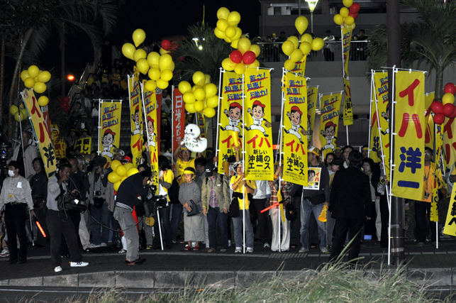 11月27日午後6時から那覇市新都心のおもろまちで、イハ洋一さんの打ち上げ式が行われました。11月11日の公示以来、17日間続いた沖縄県知事選挙を締めくくる打ち上げ式には、イハさんを推薦した社民・社大・共産3党や労働団体の代表者をはじめとして、支持者約2000人が集まり、翌28日の投票で、イハさんの当選を勝ち取ることを誓いました。