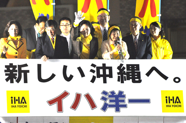 1965年に県知事をはじめて自分たちの手で選んでから、11回目の県知事選挙です。でも皆さん、今回の知事選挙はこれまでの選挙以上に、沖縄の歴史にとって重要な選挙です。全ての県民が平和で豊かに暮らすために、イハ洋一さんを私たちの新しい知事に当選させましょう。明日の投票箱が閉まるまで、全ての力を出し合いながら、勝利を勝ち取ろうではありませんか。