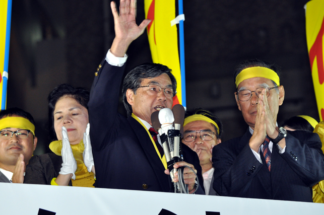 SACO合意から14年、市民投票から13年、名護市民はつらい思いを強いられて過ごしてきました。しかし市議会選挙では、県内移設に反対する多数の市議会議員を誕生させました。名護市民は14年の苦しい思いを、はっきりと「県内移設はNO」という意思で示したのです。明確な答えを出したのです。今度は県知事の番です。名護市長を勝ち取り、宜野湾市長を勝ち取り、県知事を勝ち取ることで、強い3本の矢ができるのです。県民の皆さん、イハ洋一を県知事に当選させることで、名護市民の思いを、願いをかなえてください。