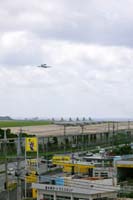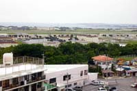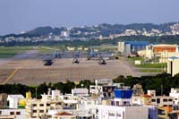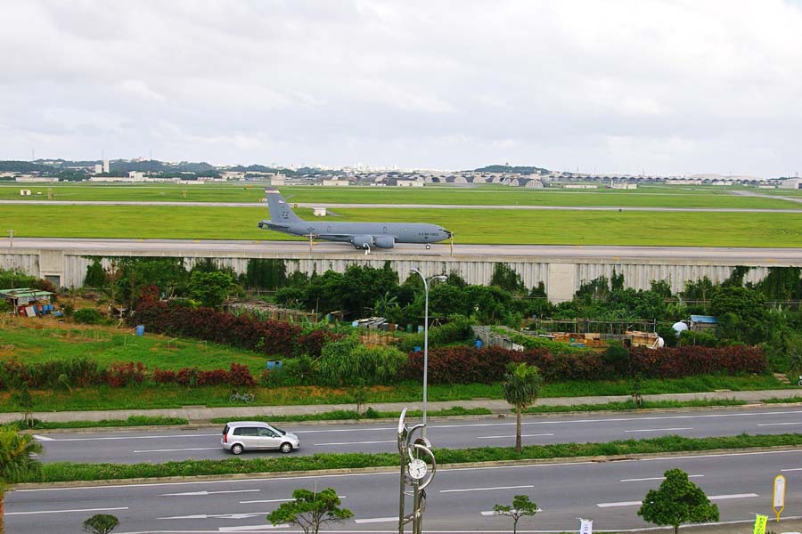 (1)(2)(4)米空軍・嘉手納基地。滑走路のすぐそばを国道58号線がとおり、国道の向いには民家が建ち並んでいる。