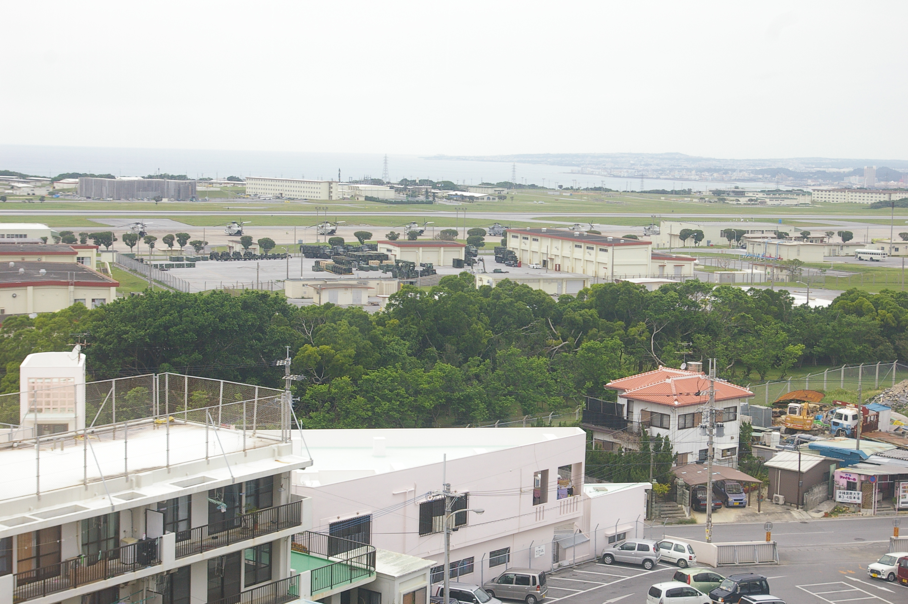(3)沖縄国際大学の校舎から見た、米海兵隊・普天間基地。04年8月のヘリ墜落事故では、海兵隊員がフェンスを乗り越えて大学内に不法侵入した。