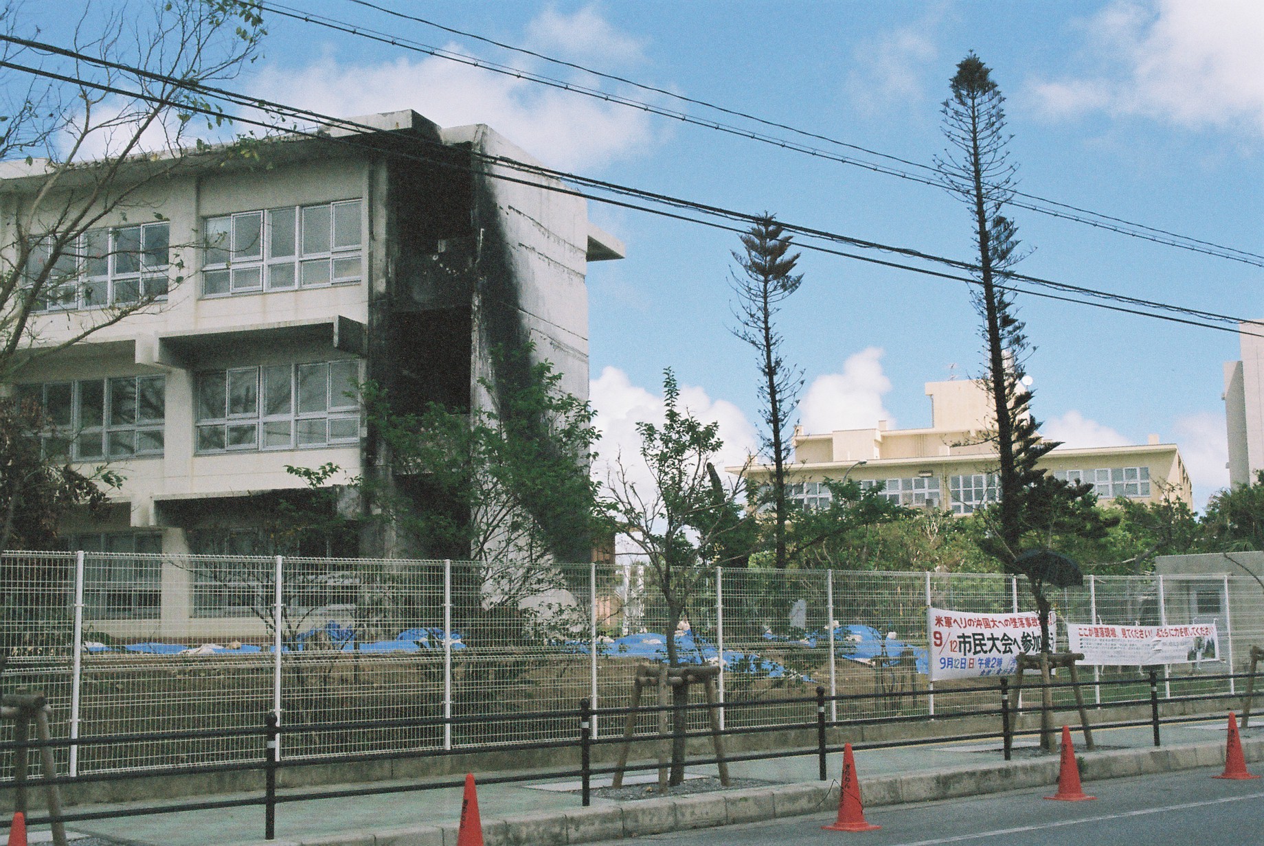 (4)沖縄国際大学。隣接する米海兵隊・普天間基地のヘリコプターが04年8月に校内に墜落した。
