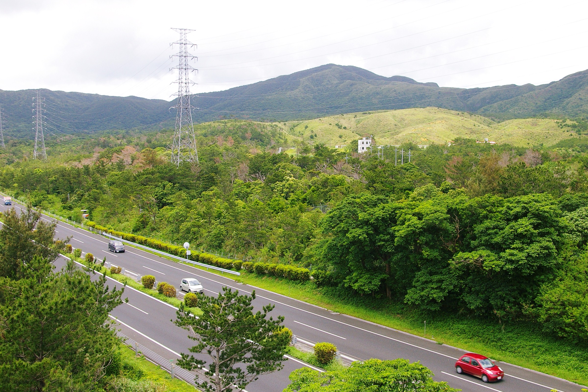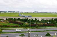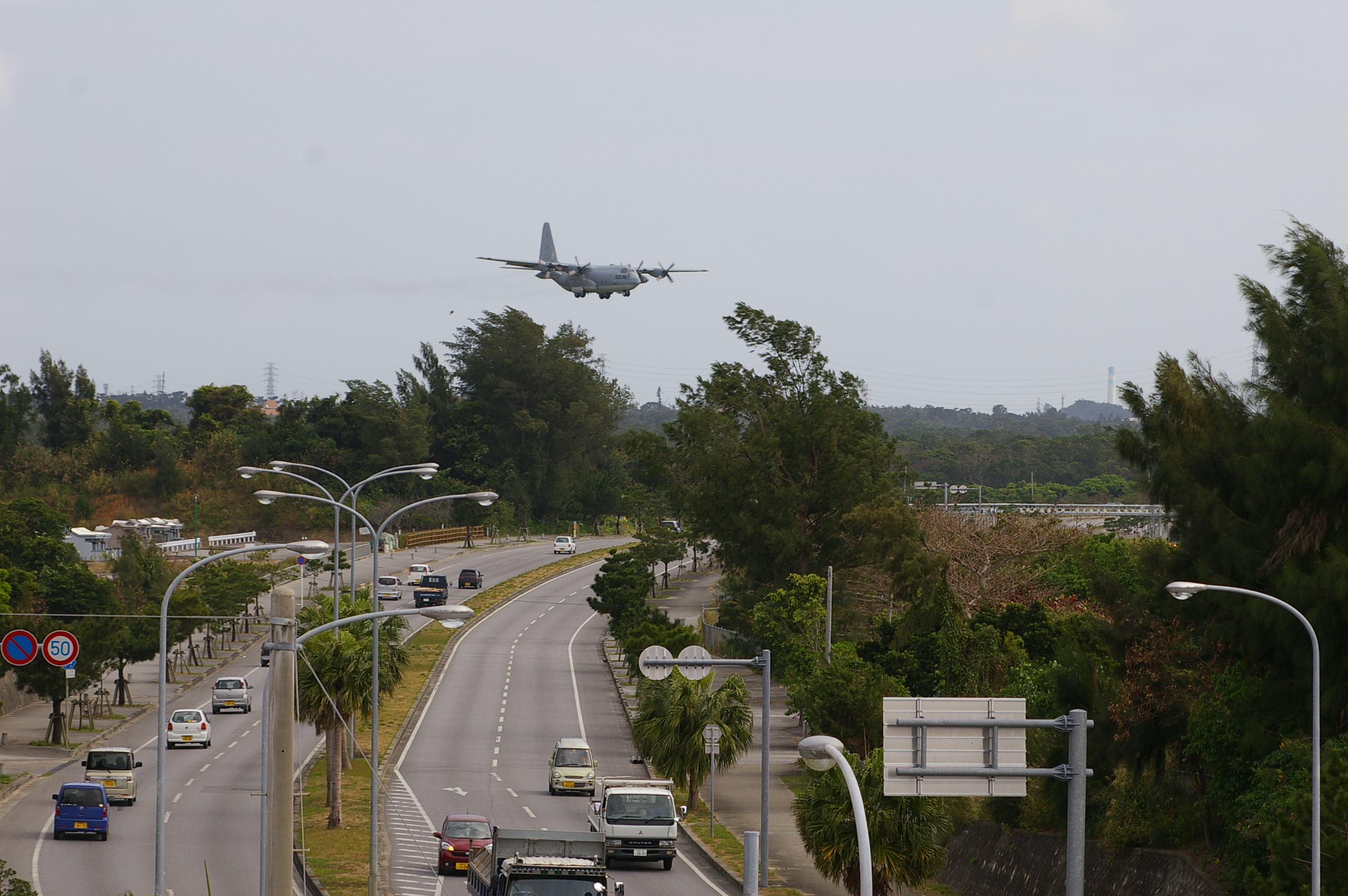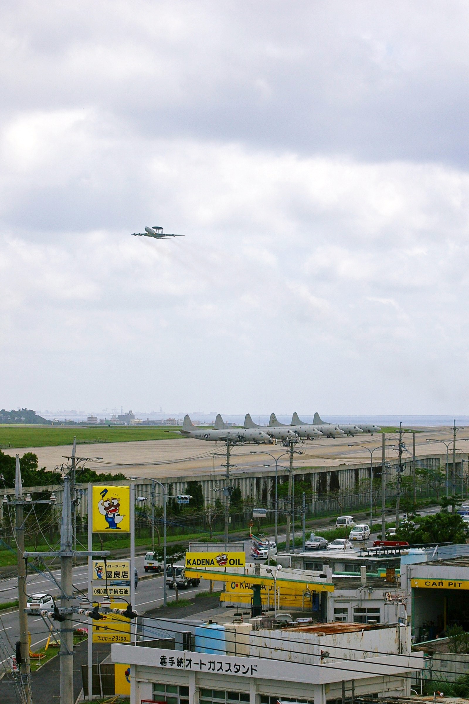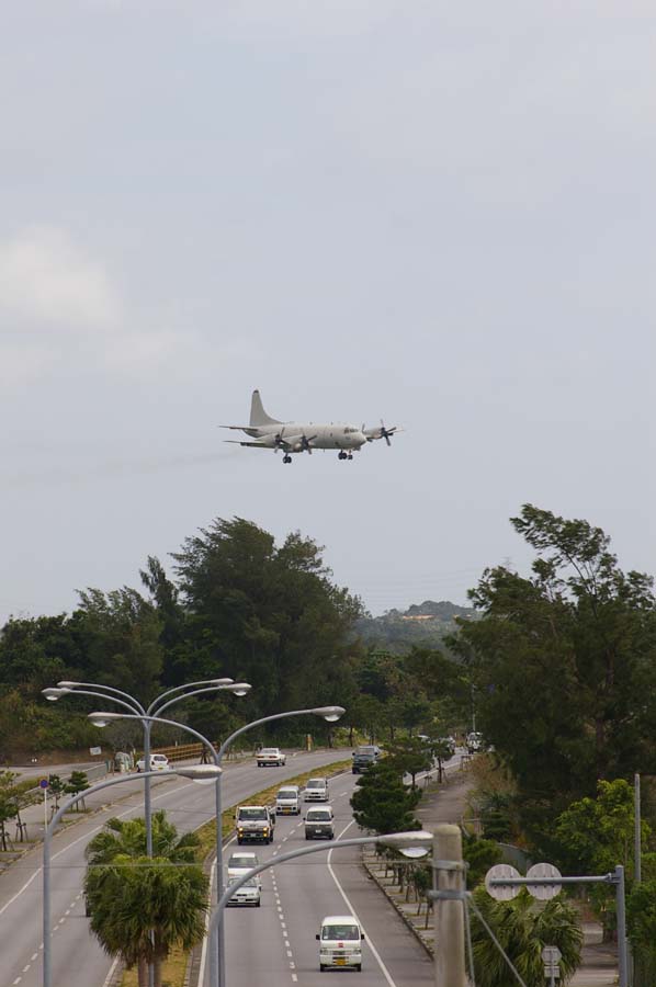 (3)(8)米空軍・嘉手納基地に沿って走る国道58号線。嘉手納基地を離着陸する米軍機が、上空を行きかう。