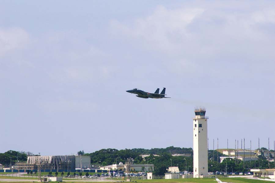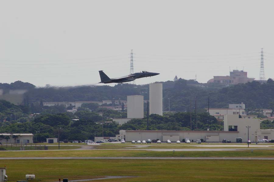 (5)(6)米空軍・嘉手納基地。離陸するF15戦闘機。昼夜かまわぬ爆音は、周辺住民の生活を妨げている。