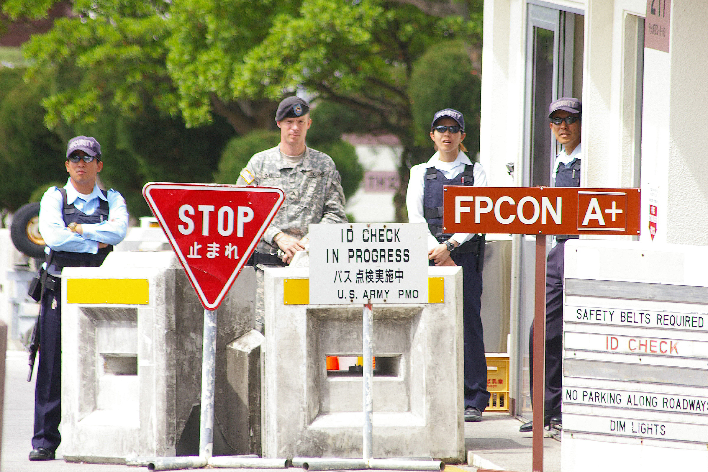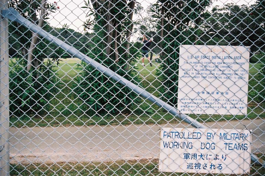 (2)トリイ・ステーション正面ゲートの内側。迷彩服を着た米兵が鋭い目でみつめる。