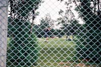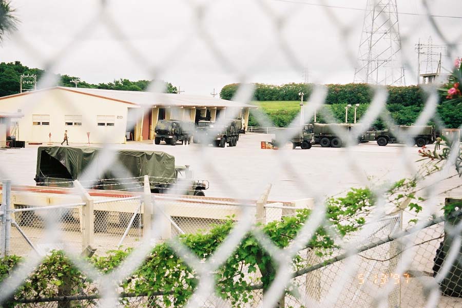 (2)(3)フェンス越しに見るキャンプ・ハンセン。軍用車両がならんでいる。