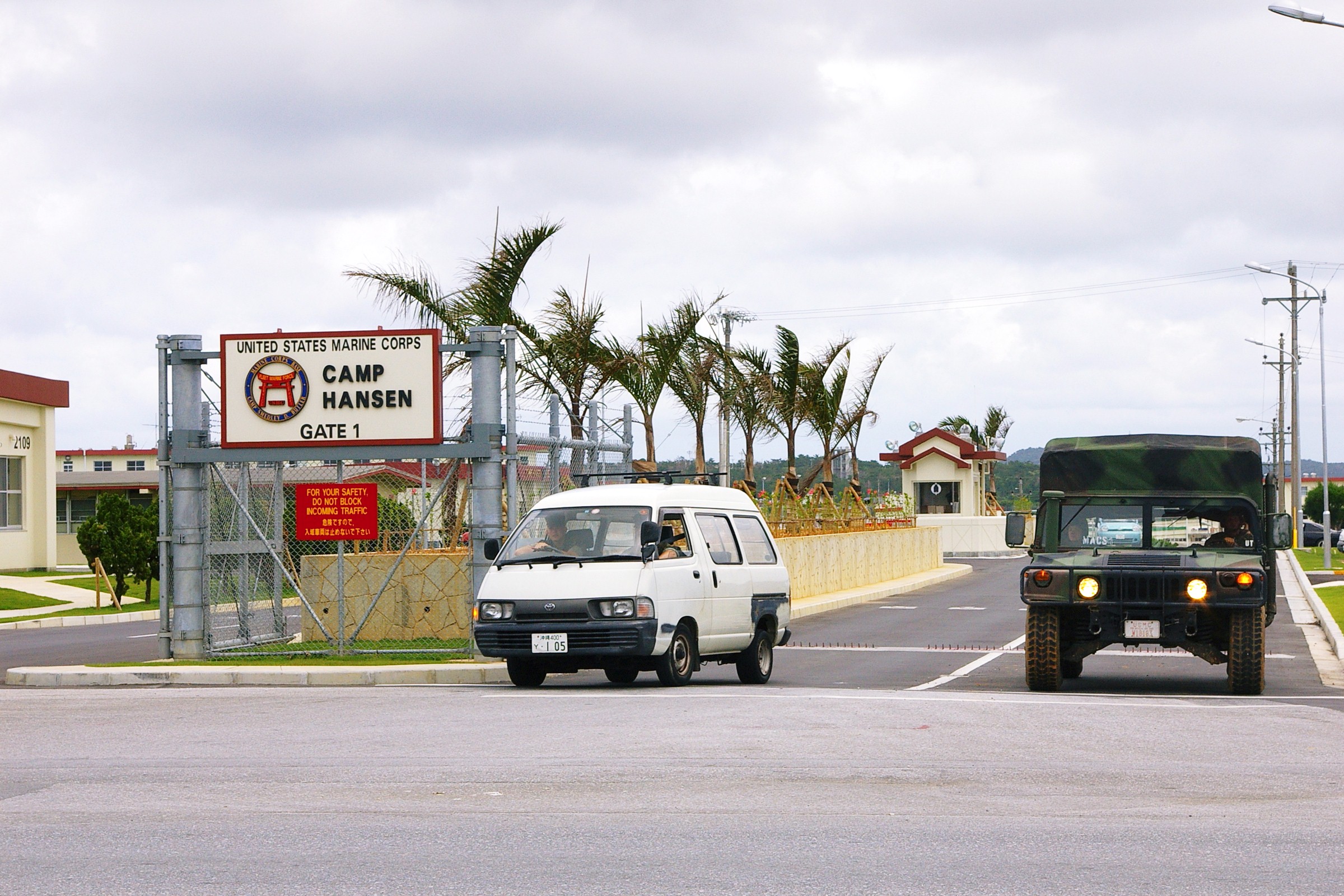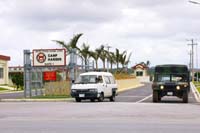 (1)キャンプ・ハンセンの正面ゲート。軍用車両が行きかう。