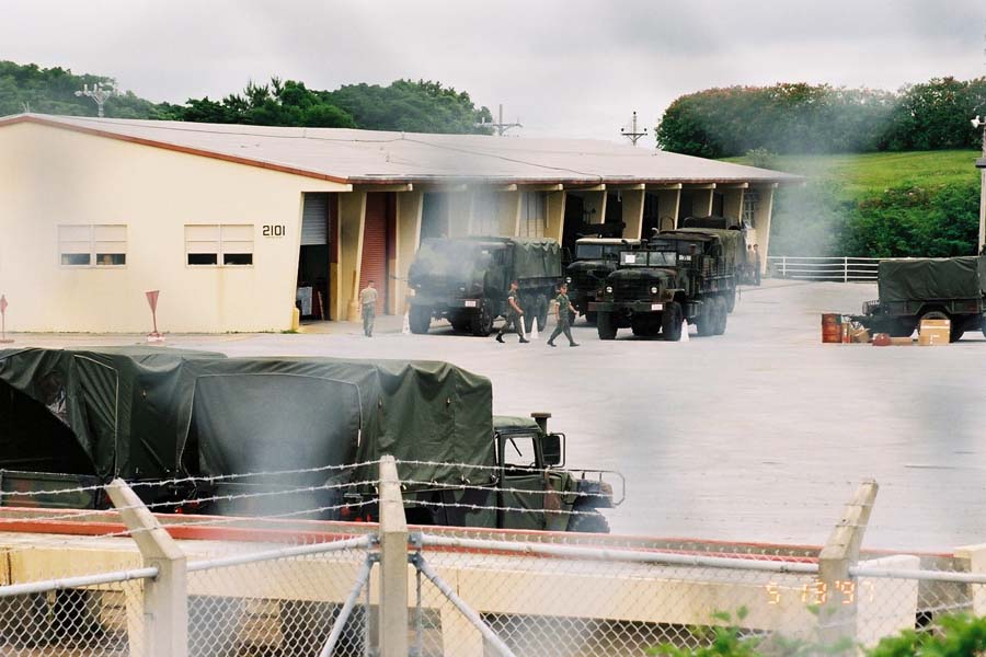 (3)キャンプ・シュワブ。基地の中には、軍用車両がならんでいる。