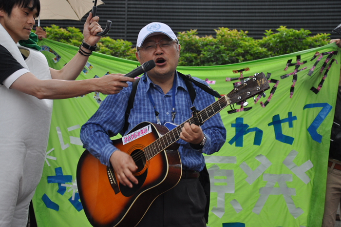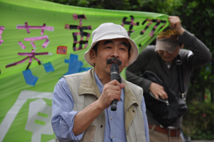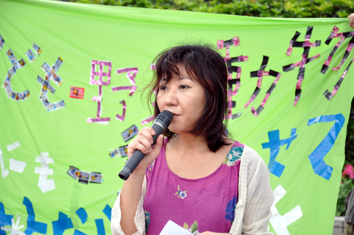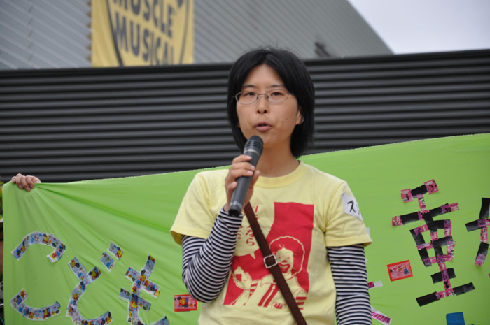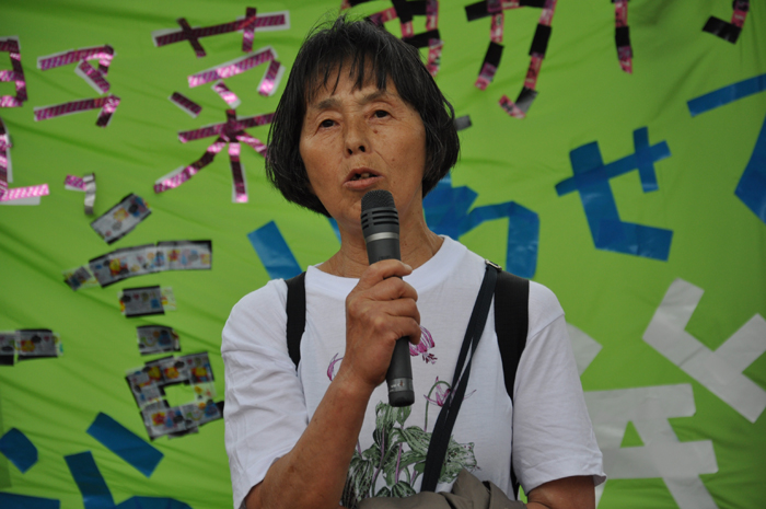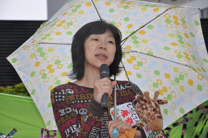 ●内田聖子さん(PARC事務局長) 午前中は晴れていて、こんなデモ日よりはないと、自分たちの日ごろの素行のよさを褒めあっていました。けれども、2時過ぎから雲行きが怪しくなってきました。もともと雨を心配していましたが、集会とデモは最後まで行います。傘やカッパを各自で用意してください。 この集会とデモは、第1回目を4月16日に、同じく渋谷の神宮前公園で行いました。その頃は原発事故から約1か月がたっていて、特に風評被害という言葉がいわれていました。その時には福島や茨城の農家の方々などに話をしていただきました。いま海に放射能が垂れ流されていて、これからは海洋汚染がさらに深刻になってくると思います。そうした中で、農業や漁業は先行きが分からず、出荷できない。基準値を下回る野菜でも出荷できない状態が続いています。福島県内では特に、今後農業ができるのだろうかという中で、皆さんが生活をしています。中には、ダメになっても種をまきたいと、いまも種をまいて収穫の準備をしている農家もあります。 私たちは、消費者として、また東京電力が福島原発で作った電気を使ってきた者として、声なき声の野菜や魚や家畜の立場になって、また耳を澄ませて、その思いを発信しようと思います。前回のデモは大好評で、1500人の方々が集まりました。今回も、それ以上の方に来ていただきたいと思います。 また今回は野菜や魚に加えて、子どもの問題を訴えたいと思います。福島では子どもの放射線の基準値が、文部科学省によって20ミリシーベルトに引き上げられました。これは、あり得ない暴挙です。許されないことです。問題を指摘されて、原子力安全・保安院が「20ミリシーベルトとは言ってない」としても、文部科学省は基準を撤回しません。親の声や市民の声に、耳を貸そうともしない。そうした状態です。ですから今回は、子どもたちの命を守ることも、デモのテーマに入れました。 もう一つ、20キロ圏内では、家畜動物も含めて動物たちは、最終的には殺処分にすることが決まりました。ニュースなどをみて、私たちは心を痛めています。動物は、人間の行いに対して、言いたくても言えません。餌も無く死んでいく、あるいは殺処分される。 子どもたちも動物も、小さな命は、最初に殺されてしまうのです。ですから今回は、野菜・子ども・動物という3つのテーマで、「全ての命を未来につなごう」ということにしました。集会では、それぞれのテーマで、何人かの方にお話をしてもらいます。 ●西沢江美子さん(農業ジャーナリスト) 私は、山の中からやってきた、歯っかけの鬼婆なのです。もう72歳ですから、そろそろ山の中に引き込みたいと思っていた時に、こんな事件が起きてしまいました。鬼婆は、村や山や、町の隅っこや、海の浜で、みんな耐えながら生きてきました。いまものすごく怒っています。特に、浜と山の中、それから畑や田んぼで、怒っています。 例えば福島では、ずっと種をまき、畑を耕し、嫁いでから半世紀を、嫁として、女性として、家を支えて、農業をやってきました。それは家を支えるだけではなくて、自分につながる命を支えていきたい、生きていくために、いろいろな条件を勝ち取っていきたいということを、100年も前から私たちの前を歩いてきた女の人たちがいました。 いま農家の女性たちは、だいたい国民年金が月に5万円と、加工や産直などで得ているお金が1年で250万円くらい。これが1人の女性の収入ですよ。この250万円分が、完全に売れなくなっているのです。私たちは、種をまいて、収穫して、皆さんに届けて、安心して食べてもらいたい。そういう信念と誇りを持っていましたが、その誇りさえ無くなってしまいました。 でも私たちは、まき続けよう、作り続けよう、原発が無くなるまで自分たちの手で放射線量を計って基準内の物を作って届けよう。基準外が出たときには徹底的に闘おうとしています。この闘いは、非常に長くなりそうです。でも私たちは絶対に、作ることをやめません。そして安心、安全なものを求める事を続けたいと思います。それはなぜかというと、鬼婆には、可愛い孫たちがいるのです。その孫たちが、きちんと地球を支えてくれるまで、残念ながら私たちが見届けることはできませんが、その間に早く原発を無くさなければいけない。ですから、作るときは、きちっと作ります。自分たちの手で計りたいのです。東電の計るデータや、国の計るデータが、どれだけ信頼できるのか分かりません。もっと信頼できるデータを作って、少しでも数値が下がり、原発が止まって無くなるまで、皆さんとともに闘いたいと思います。 今日はとっても荒れた空です。でも、デモの最初に荒れた空なのは、良かったのではないでしょうか。というのは、もうすぐ日米安保条約の決まった、6月15日がやってきます。その時に私は、19歳でした。雨の中でデモをしたり、座り込んだり。あの時の参加者は3