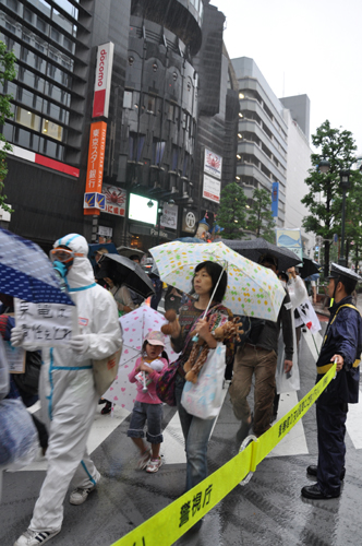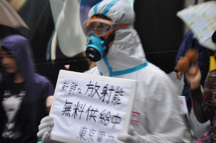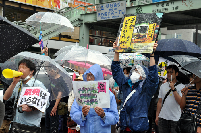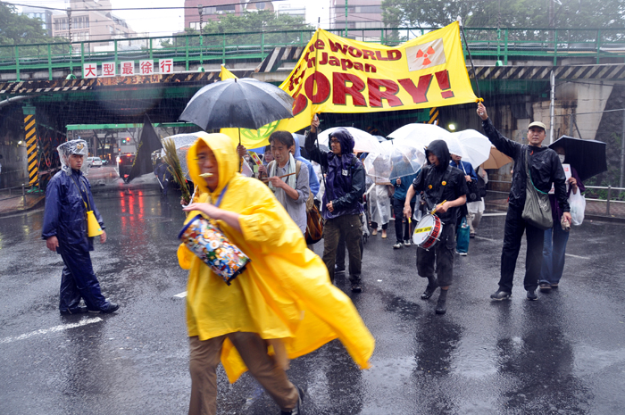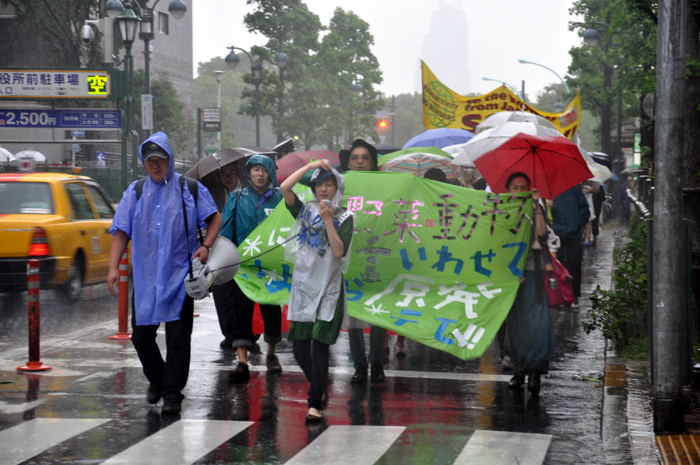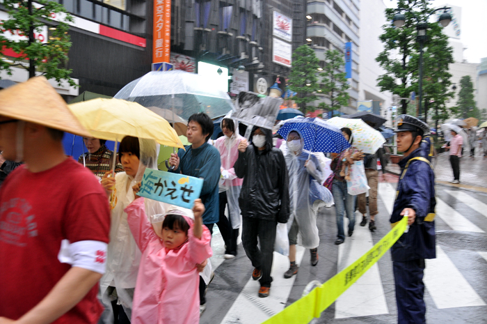 政府や東京電力は「安心だ」と言うけれども、福島第一原子力発電所の現状を考えれば、この雨にも恐らく放射性物質が混じっていることでしょう。デモでは、そうしたことも訴えながら、渋谷の街を一周しました。告知期間が短かったためか、はたまた天気予報をちゃんと見ていた人が放射能の雨を避けたためか、参加者は約300人で前回に比べると少なかったのですが、とっても元気なデモでした。