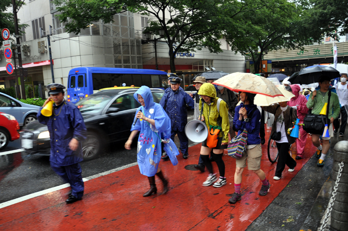 今日の様な雨の日には、早く歩きすぎて、転んだり滑ったりする人がいないように、デモの速度は特に注意が必要です。。