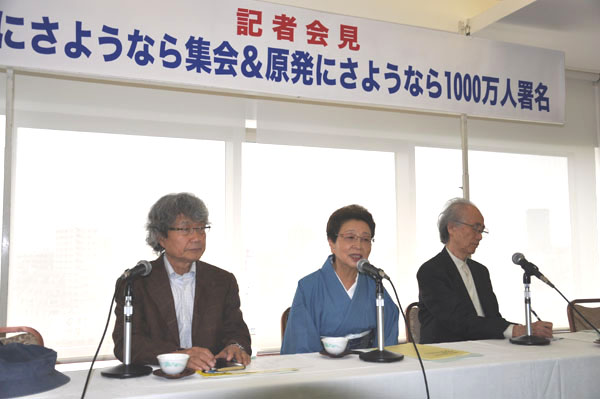 記者会見には、内橋克人さん、鎌田慧さん、澤地久枝さんの3人が出席し、原子力発電を止めるための思いを訴えました。